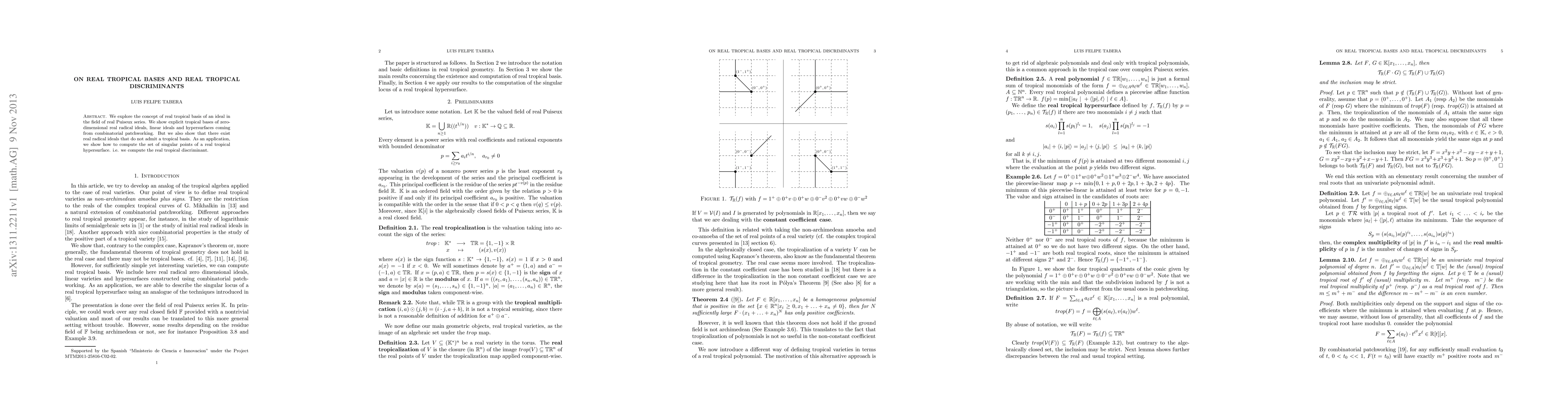 This paper investigates real tropical bases for ideals in the field of real Puiseux series, demonstrating explicit bases for zero-dimensional real radical ideals and hypersurfaces, while also proving the existence of some real radical ideals without a tropical basis. It concludes by applying the theory to compute the real tropical discriminant, identifying singular points of real tropical hypersurfaces.