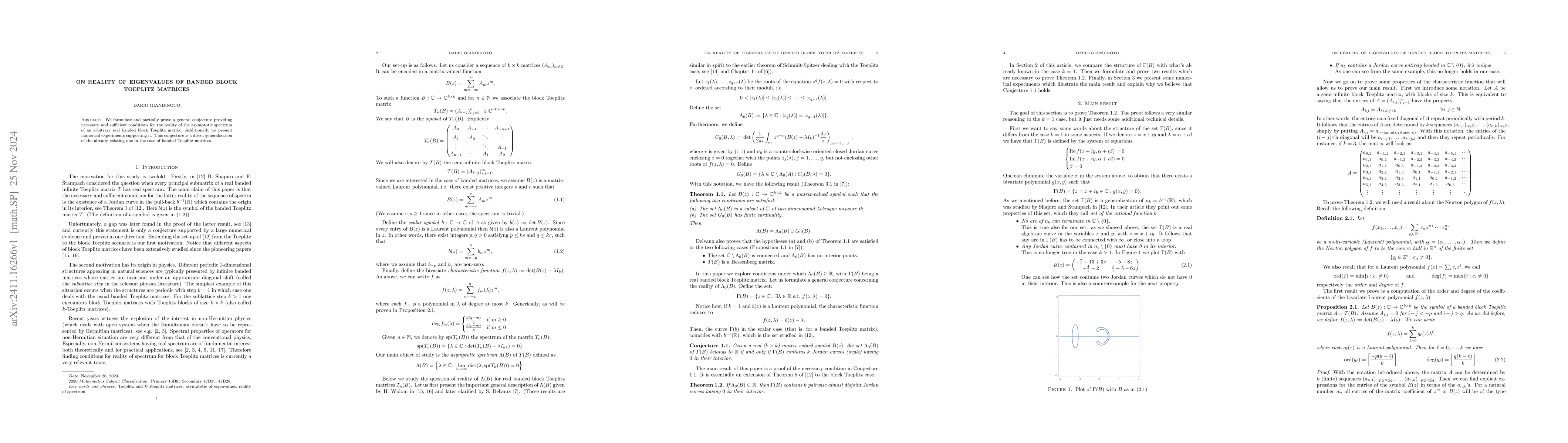 We formulate and partially prove a general conjecture providing necessary and sufficient conditions for the reality of the asymptotic spectrum of an arbitrary real banded block Toeplitz matrix. Additionally we present numerical experiments supporting it. This conjecture is a direct generalization of the already existing one in the case of banded Toeplitz matrices.