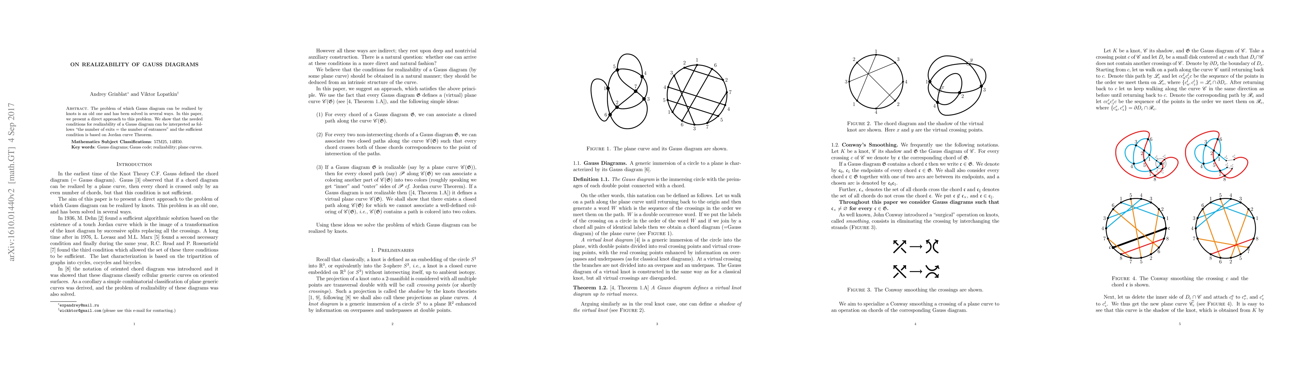 This paper proposes a direct method to determine the realizability of Gauss diagrams for knots, asserting that the number of exits must equal the number of entrances, with the Jordan curve theorem providing a sufficient condition for realizability.