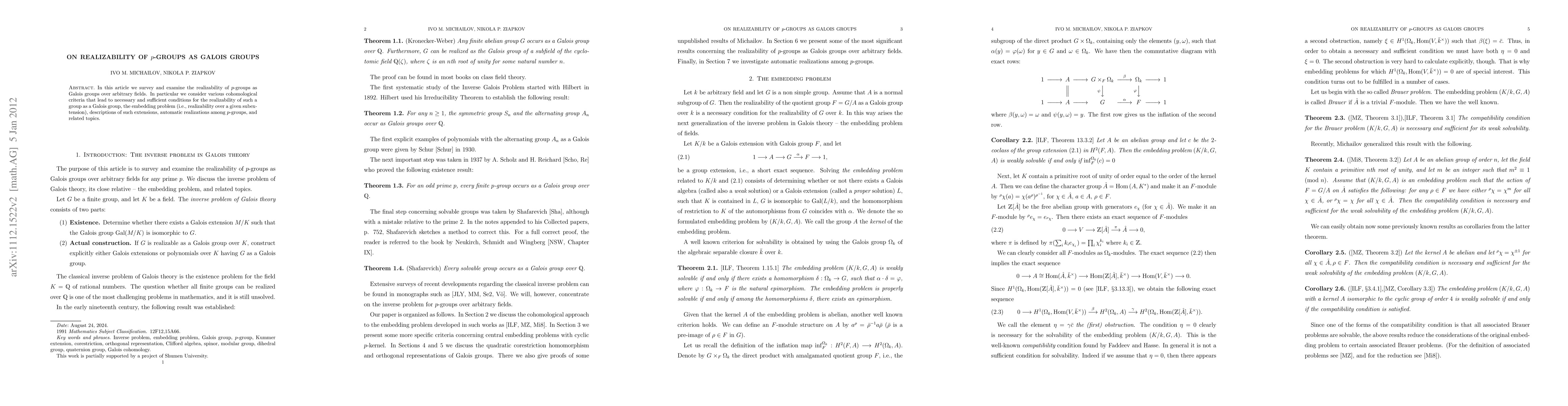 This paper surveys the realizability of $p$-groups as Galois groups over arbitrary fields, focusing on cohomological criteria, necessary and sufficient conditions, embedding problems, and automatic realizations among $p$-groups.