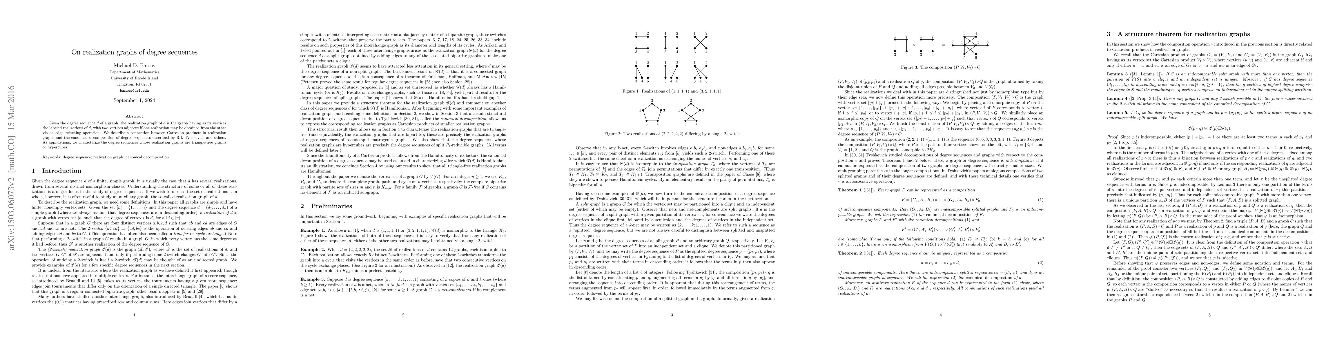 This paper explores the realization graphs of degree sequences, where vertices represent labeled realizations of a degree sequence and edges denote edge-switching operations. It establishes a link between Cartesian products in these graphs and the canonical decomposition of degree sequences, and applies this to characterize sequences whose realization graphs are triangle-free or hypercube structures.