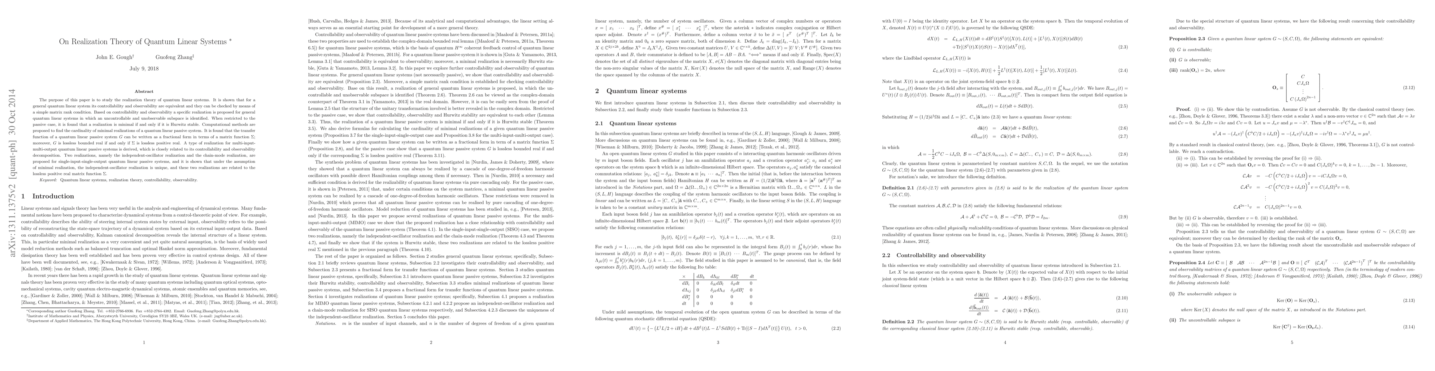 This paper explores the realization theory of quantum linear systems, demonstrating that controllability and observability are equivalent, and proposing a specific realization method. It introduces minimal realizations for passive quantum systems, showing they are stable if and only if they are Hurwitz, and provides computational methods for determining the cardinality of these minimal realizations.