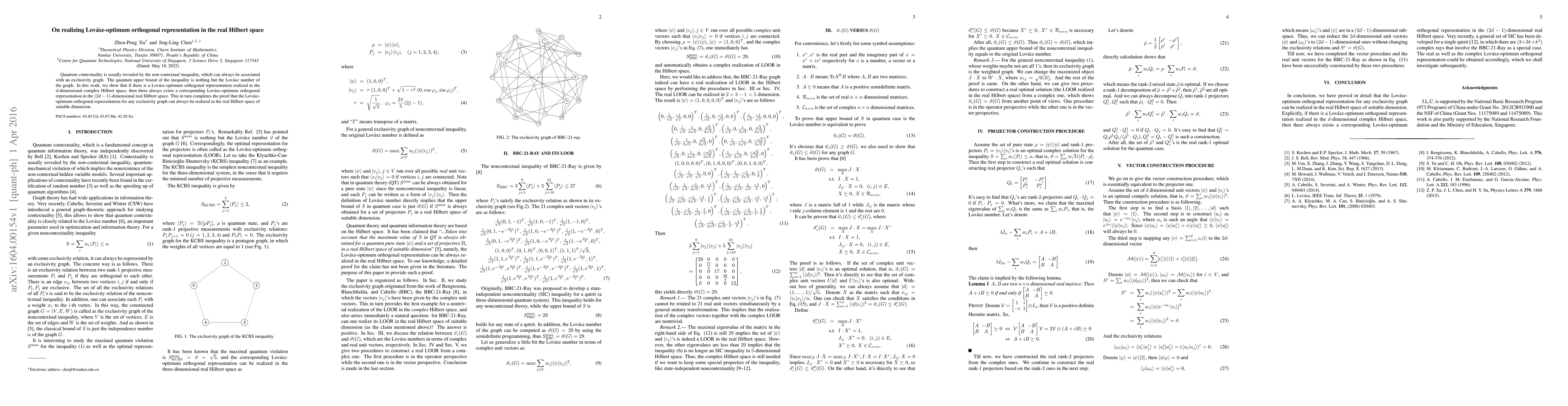 Quantum contextuality is usually revealed by the non-contextual inequality, which can always be associated with an exclusivity graph. The quantum upper bound of the inequality is nothing but the Lov\'asz number of the graph. In this work, we show that if there is a Lov\'asz-optimum orthogonal representation realized in the $d$-dimensional complex Hilbert space, then there always exists a corresponding Lov\'asz-optimum orthogonal representation in the $(2d-1)$-dimensional real Hilbert space. This in turn completes the proof that the Lov\'asz-optimum orthogonal representation for any exclusivity graph can always be realized in the real Hilbert space of suitable dimension.