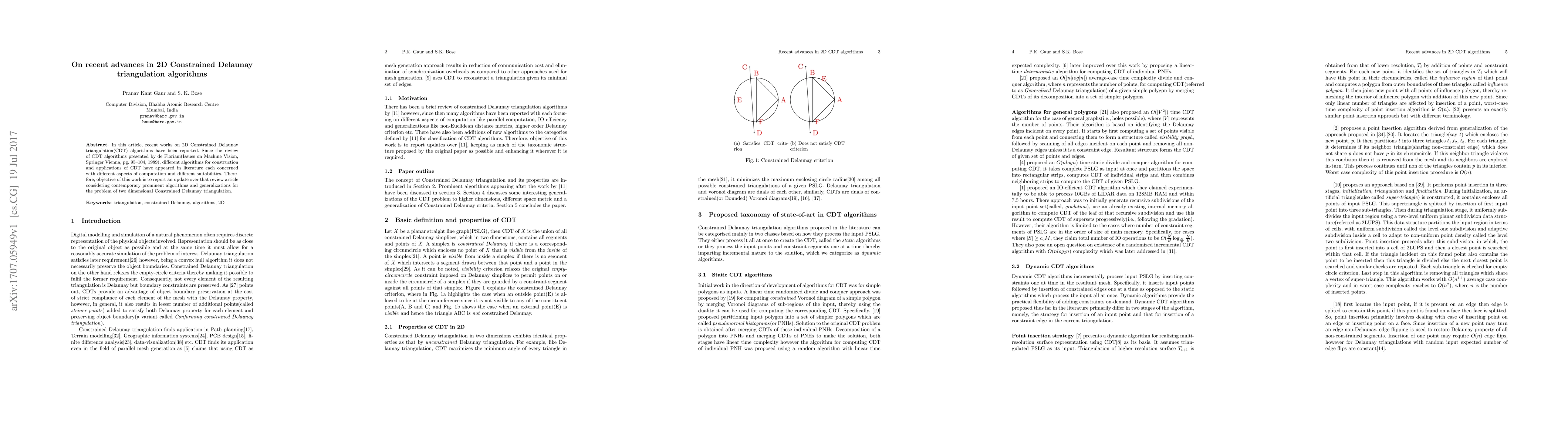 This paper reviews recent advancements in 2D Constrained Delaunay Triangulation (CDT) algorithms, focusing on contemporary methods and their applications since the 1989 review by de Floriani, highlighting new developments and generalizations in the field.