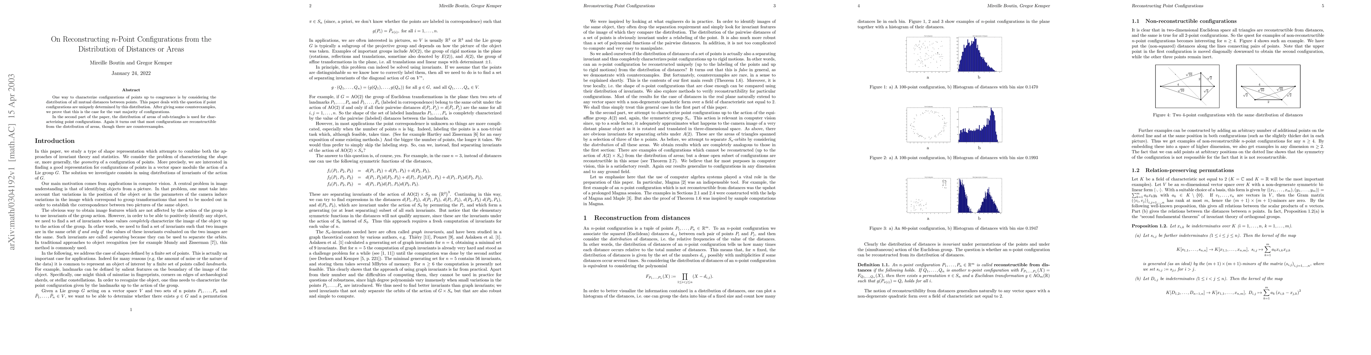 One way to characterize configurations of points up to congruence is by considering the distribution of all mutual distances between points. This paper deals with the question if point configurations are uniquely determined by this distribution. After giving some counterexamples, we prove that this is the case for the vast majority of configurations. In the second part of the paper, the distribution of areas of sub-triangles is used for characterizing point configurations. Again it turns out that most configurations are reconstructible from the distribution of areas, though there are counterexamples.