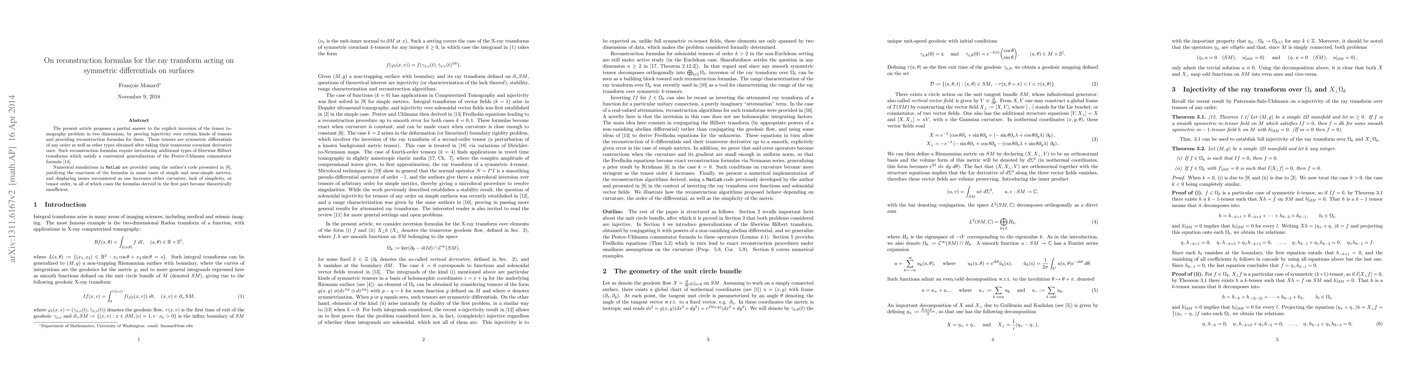 The present article proposes a partial answer to the explicit inversion of the tensor tomography problem in two dimensions, by proving injectivity over certain kinds of tensors and providing reconstruction formulas for them. These tensors are symmetric differentials of any order as well as other types obtained after taking their transverse covariant derivative once. Such reconstruction formulas require introducing additional types of fiberwise Hilbert transforms which satisfy a convenient generalization of the Pestov-Uhlmann commutator formula \cite{Pestov2005}. Numerical simulations in {\tt MatLab} are provided using the author's code presented in \cite{Monard2013}, justifying the exactness of the formulas in some cases of simple and near-simple metrics, and displaying issues encountered as one increases either curvature, lack of simplicity, or tensor order, in all of which cases the formulas derived in the first part become theoretically insufficient.