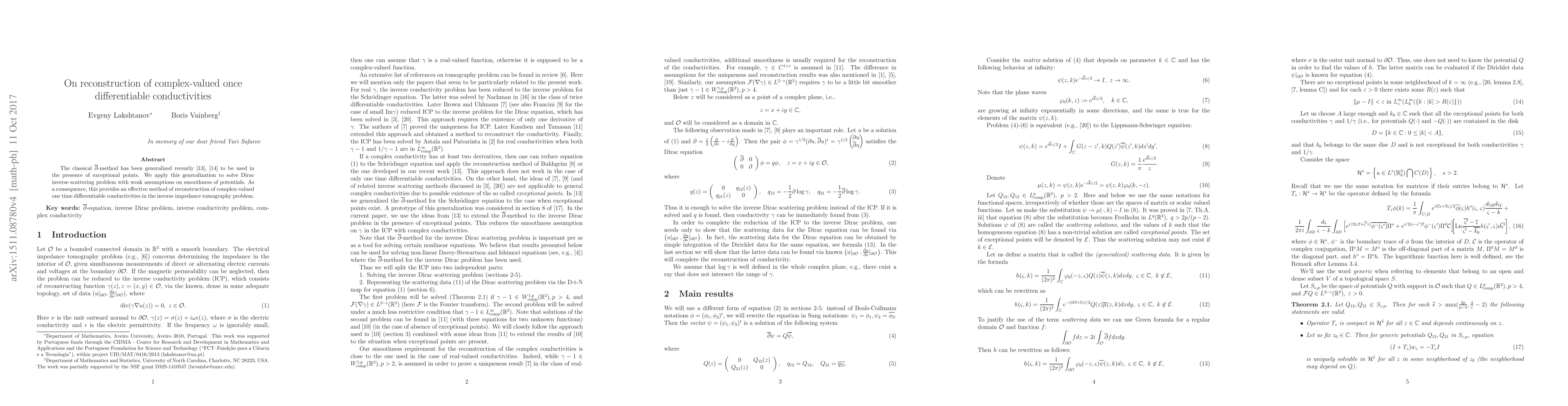 This paper generalizes the $\overline \partial$-method to handle exceptional points, enabling the solution of the Dirac inverse scattering problem with minimal smoothness assumptions on potentials. The method effectively reconstructs complex-valued once differentiable conductivities in inverse impedance tomography.