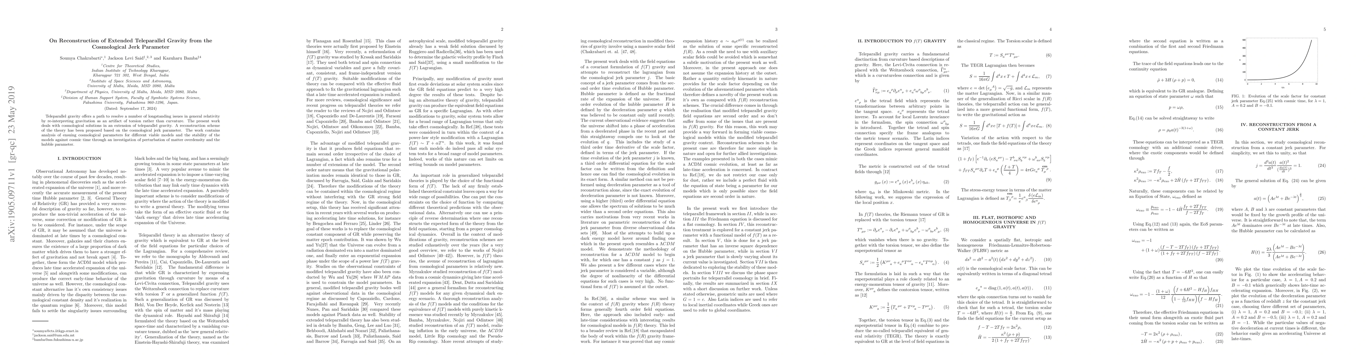 This paper proposes a reconstruction scheme for extended teleparallel gravity using the cosmological jerk parameter, analyzing the stability and cosmological parameters of various models through perturbations in matter overdensity and the Hubble parameter. The study aims to resolve longstanding issues in general relativity by reinterpreting gravitation through torsion.