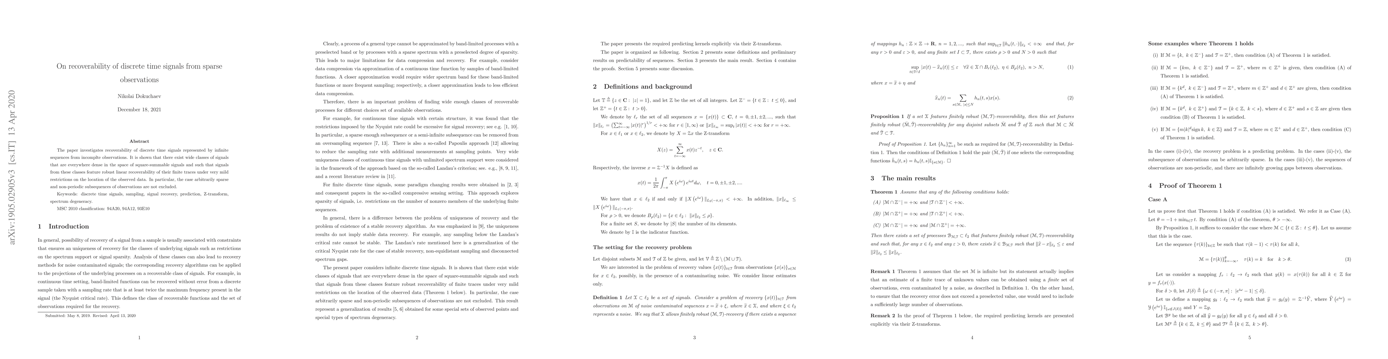 This paper explores the recoverability of discrete time signals from sparse, incomplete observations, demonstrating that certain dense signal classes allow for robust linear recovery under minimal constraints on observation locations. It covers scenarios with arbitrarily sparse and non-periodic observation subsequences.