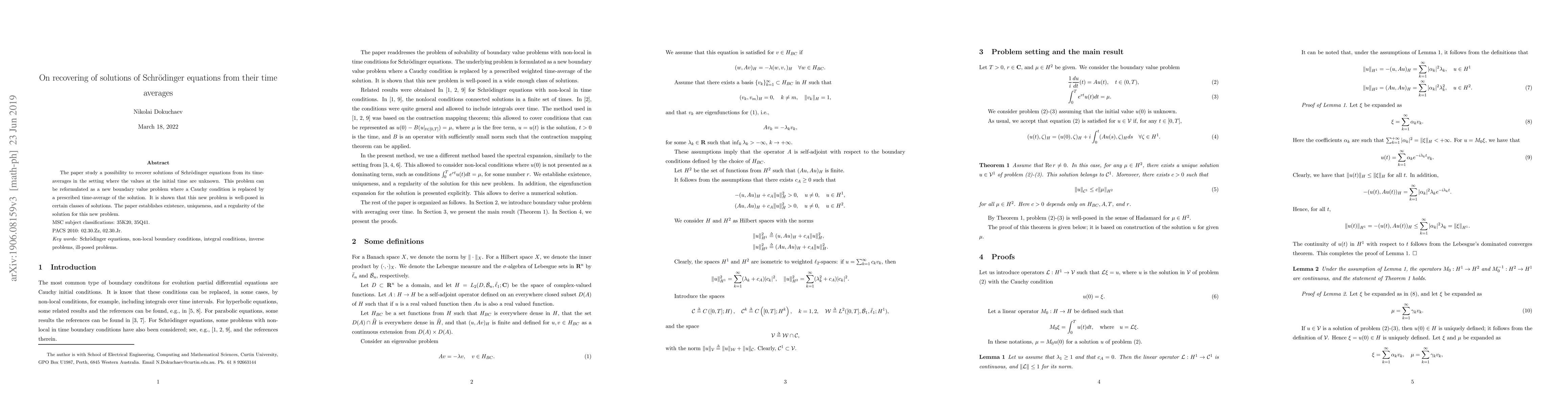 The paper investigates the recovery of Schrödinger equation solutions from their time averages when initial values are unknown, reformulating it as a new boundary value problem. It demonstrates the well-posedness, existence, uniqueness, and regularity of solutions for this reformulated problem.