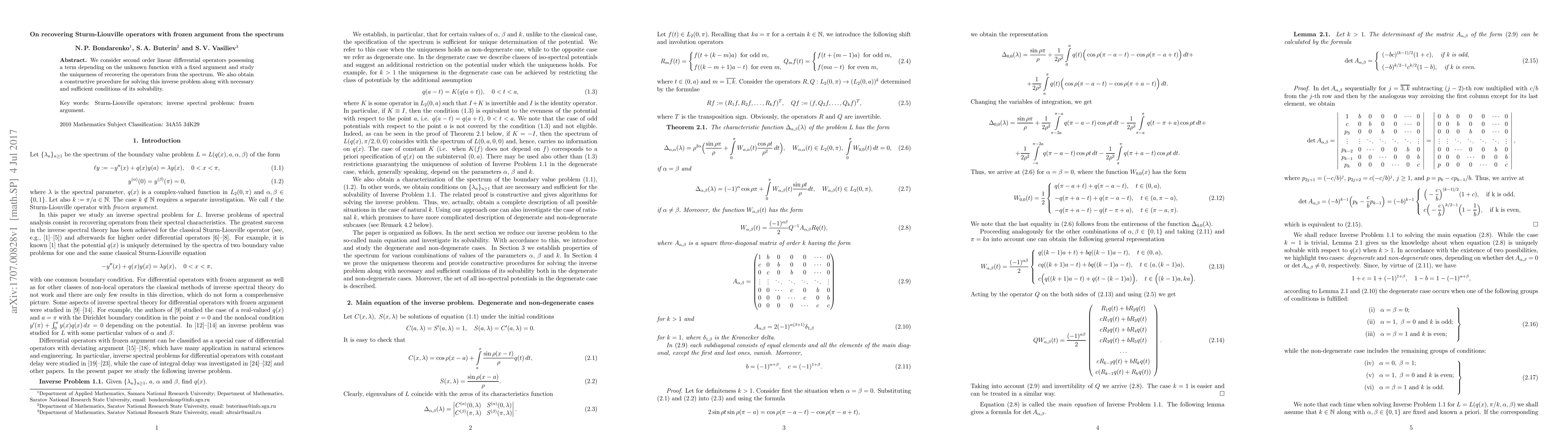 This paper investigates the uniqueness of recovering second-order Sturm-Liouville operators with a frozen argument term from the spectrum and provides a constructive method for solving this inverse problem, along with necessary and sufficient conditions for its solvability.