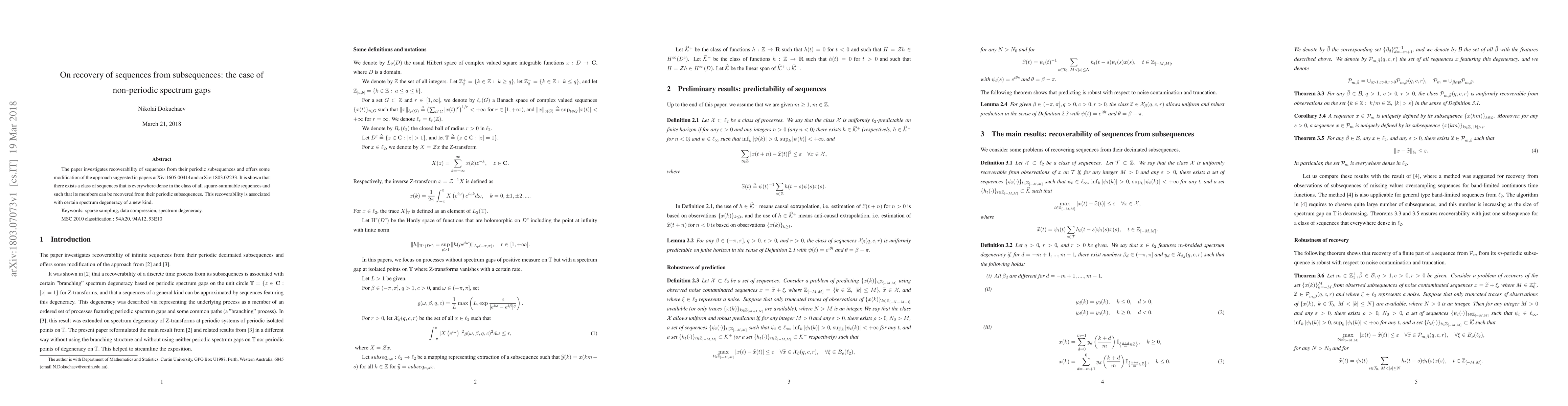 This research identifies a dense class of square-summable sequences recoverable from periodic subsequences, linked to unique spectrum degeneracy. It modifies previous approaches from arXiv:1605.00414 and arXiv:1803.02233.
