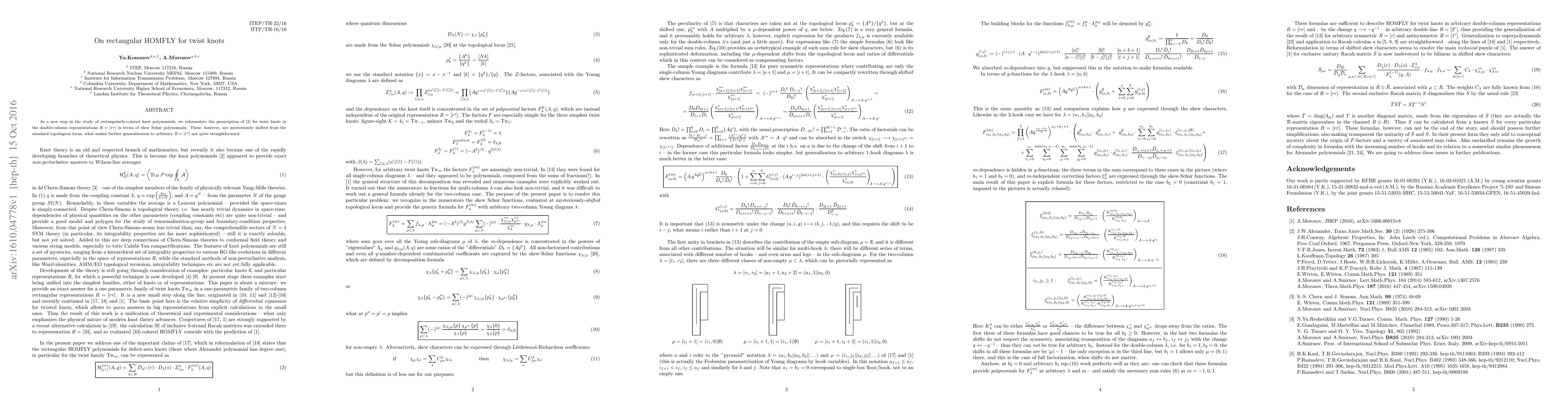 This paper reformulates the rectangular HOMFLY polynomial for twist knots using skew Schur polynomials, but notes a mysterious shift from the standard topological locus, complicating generalization to arbitrary rectangular representations.
