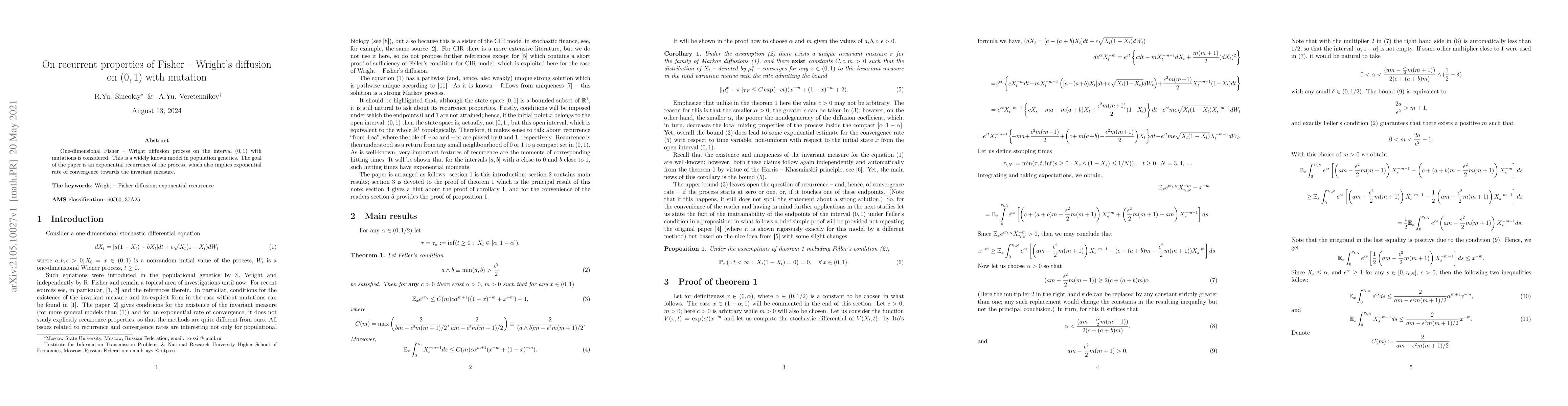 One-dimensional Fisher-Wright diffusion process on the interval $(0,1)$ with mutations is considered. This is a widely known model in population genetics. The goal of the paper is an exponential recurrence of the process, which also implies exponential rate of convergence towards the invariant measure.