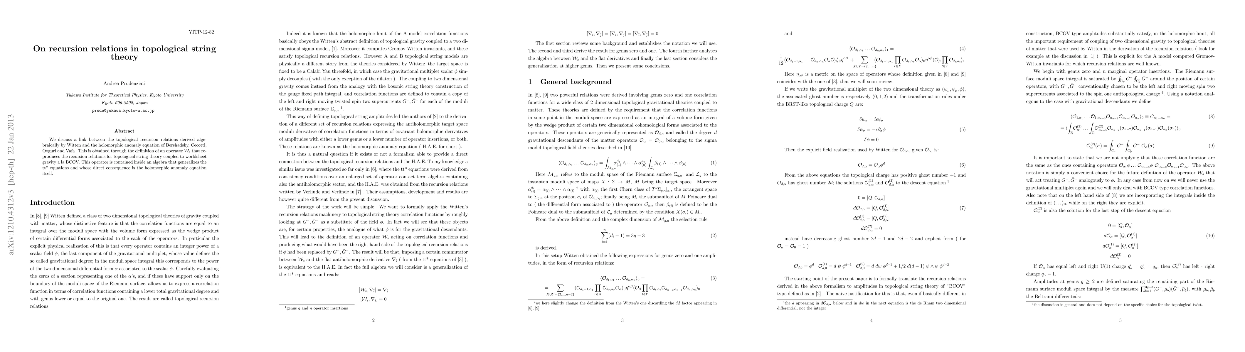We discuss a link between the topological recursion relations derived algebraically by Witten and the holomorphic anomaly equation of Bershadsky, Cecotti, Ooguri and Vafa. This is obtained through the definition of an operator ${\cal{W}}_s$ that reproduces the recursion relations for topological string theory coupled to worldsheet gravity a la BCOV. This operator is contained inside an algebra that generalizes the tt* equations and whose direct consequence is the holomorphic anomaly equation itself.