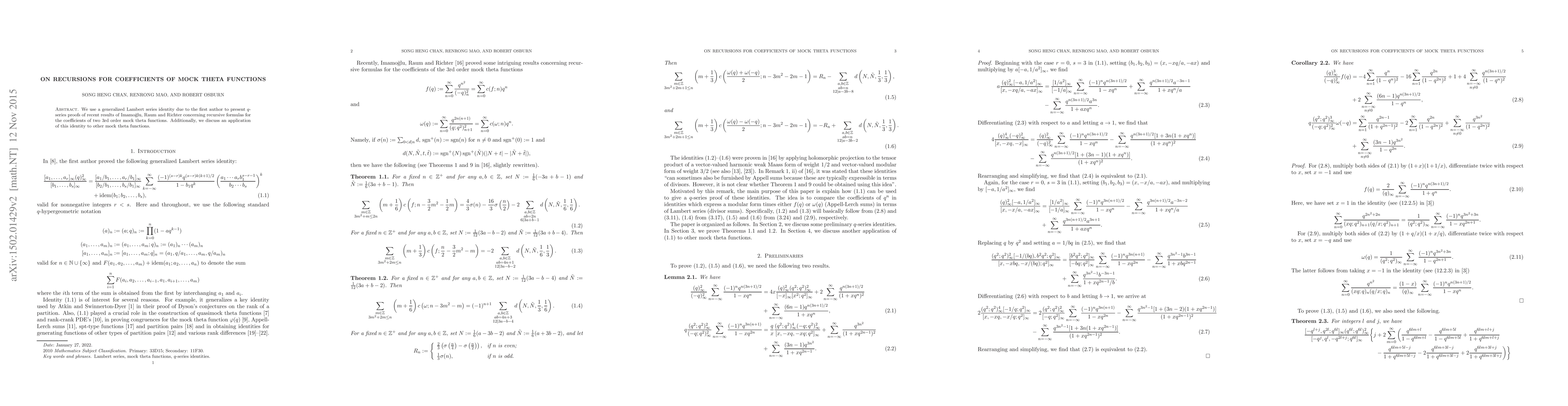 We use a generalized Lambert series identity due to the first author to present q-series proofs of recent results of Imamoglu, Raum and Richter concerning recursive formulas for the coefficients of two 3rd order mock theta functions. Additionally, we discuss an application of this identity to other mock theta functions.