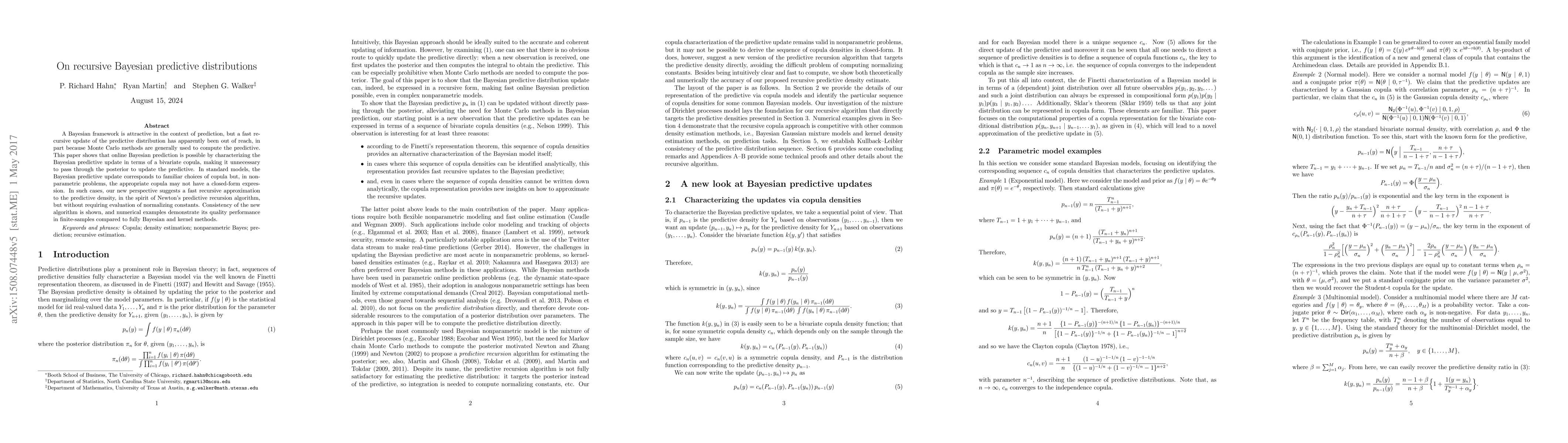 This paper proposes a novel recursive Bayesian method for updating predictive distributions without relying on Monte Carlo methods, using a bivariate copula framework. The method offers a fast, consistent approximation for both standard and nonparametric models, demonstrating competitive performance in numerical examples.