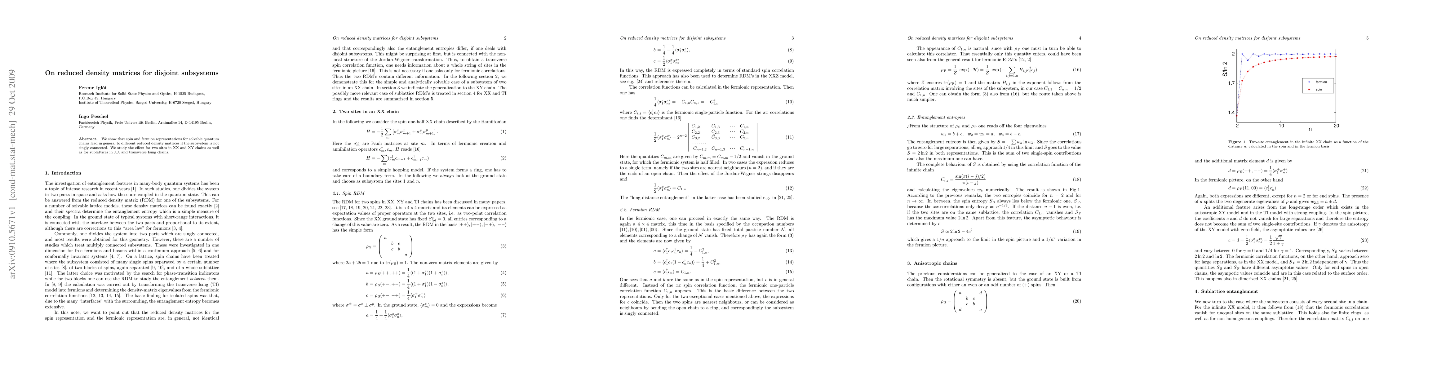 We show that spin and fermion representations for solvable quantum chains lead in general to different reduced density matrices if the subsystem is not singly connected. We study the effect for two sites in XX and XY chains as well as for sublattices in XX and transverse Ising chains.