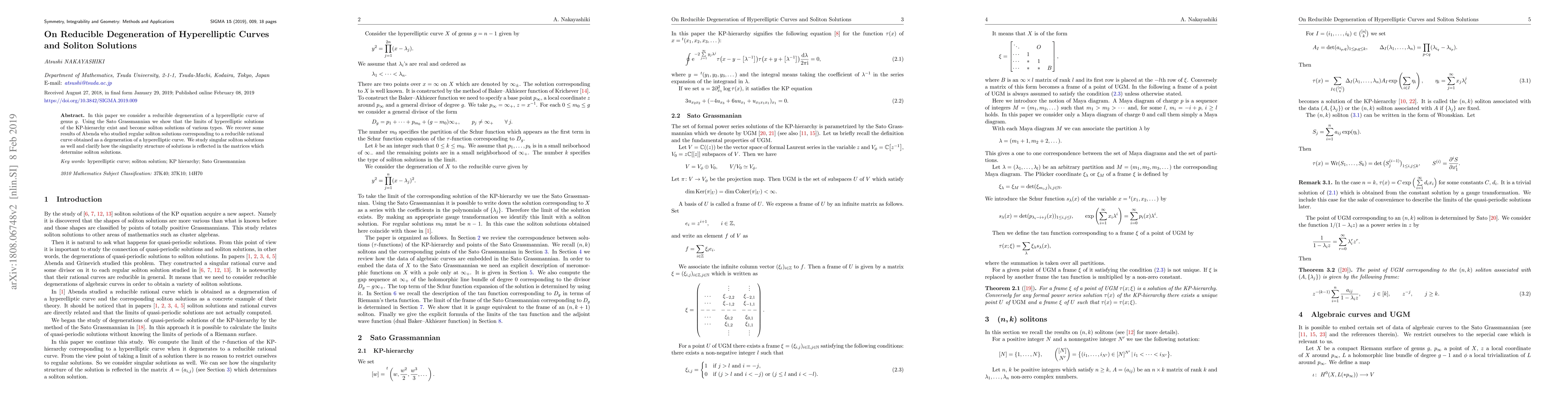 This paper investigates the reducible degeneration of hyperelliptic curves of genus $g$ and demonstrates that the limits of hyperelliptic solutions of the KP-hierarchy become soliton solutions, using the Sato Grassmannian framework. It also explores singular soliton solutions and their corresponding singularity structures.