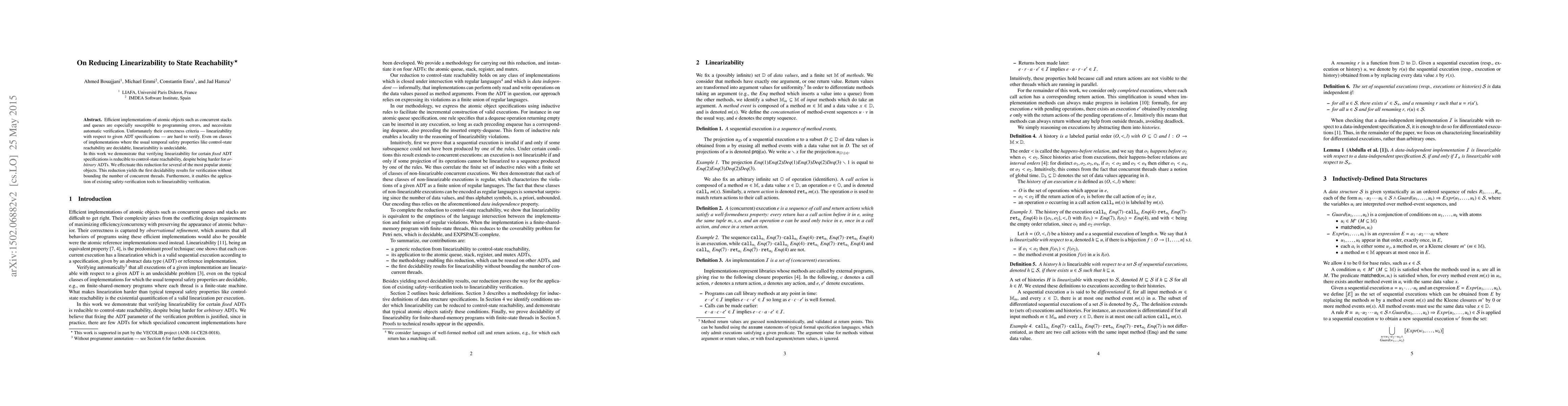 This paper demonstrates that verifying linearizability for specific atomic data types (ADTs) can be reduced to control-state reachability, enabling the use of existing safety-verification tools. This reduction provides the first decidability results for linearizability verification without limiting the number of concurrent threads.
