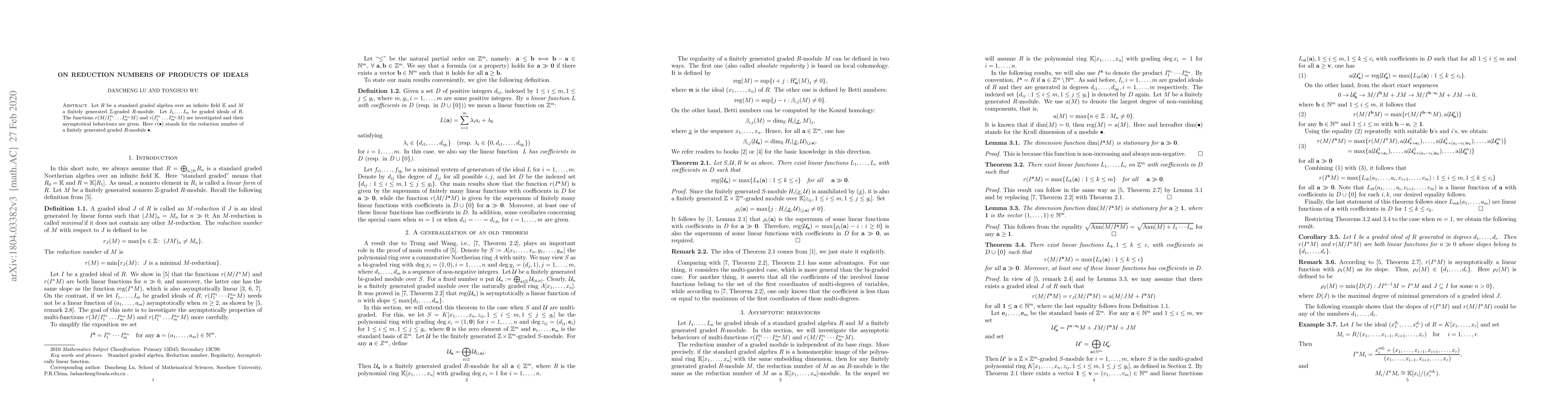 This paper investigates the reduction numbers of quotient modules and products of graded ideals in a standard graded algebra over an infinite field, providing asymptotic behavior for these functions. The focus is on understanding how the reduction number behaves under various powers of the ideals.
