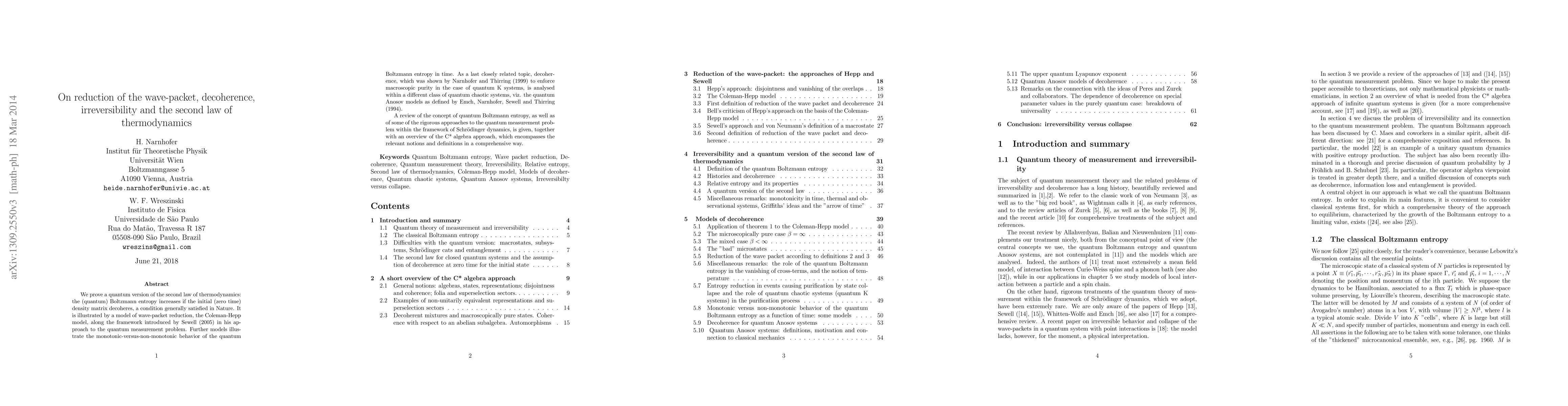 We prove a quantum version of the second law of thermodynamics: the (quantum) Boltzmann entropy increases if the initial (zero time) density matrix decoheres, a condition generally satisfied in Nature. It is illustrated by a model of wave-packet reduction, the Coleman-Hepp model, along the framework introduced by Sewell in his approach to the quantum measurement problem. Further models illustrate the monotonic-versus-non-monotonic behavior of the quantum Boltzmann entropy in time. As a last closely related topic, decoherence, which was shown by Narnhofer and Thirring to enforce macroscopic purity in the case of quantum K systems, is analysed within a different class of quantum chaotic systems, viz. the quantum Anosov models as defined by Emch, Narnhofer, Sewell and Thirring. A review of the concept of quantum Boltzmann entropy, as well as of some of the rigorous approaches to the quantum measurement problem within the framework of Schr\"{o}dinger dynamics, is given, together with an overview of the C* algebra approach, which encompasses the relevant notions and definitions in a comprehensive way.
