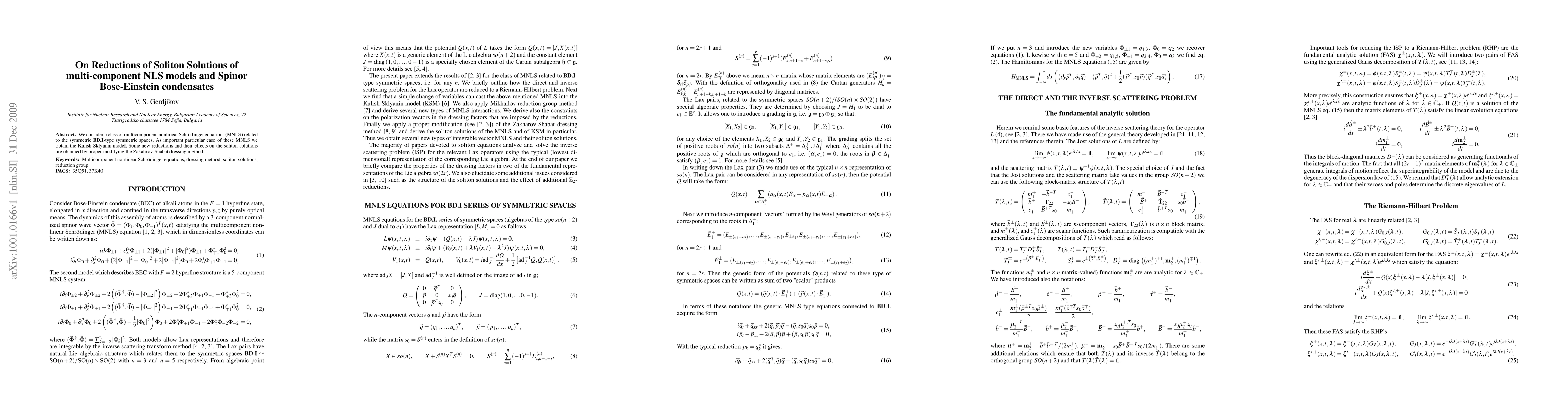 We consider a class of multicomponent nonlinear Schrodinger equations (MNLS) related to the symmetric BD.I-type symmetric spaces. As important particular case of these MNLS we obtain the Kulish-Sklyanin model. Some new reductions and their effects on the soliton solutions are obtained by proper modifying the Zakahrov-Shabat dressing method.