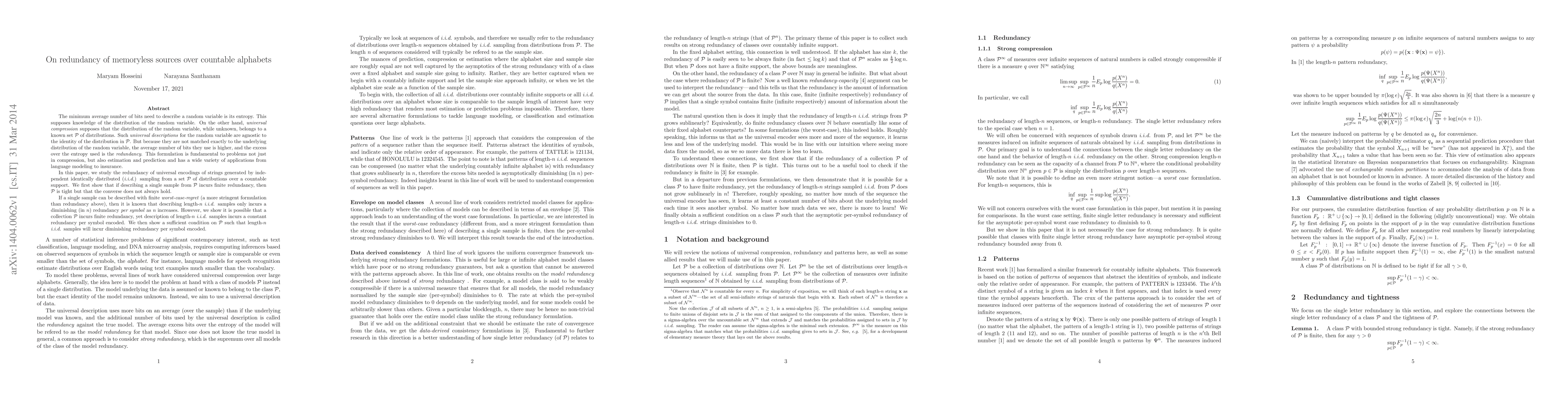 The minimum average number of bits need to describe a random variable is its entropy, assuming knowledge of the underlying statistics On the other hand, universal compression supposes that the distribution of the random variable, while unknown, belongs to a known set $\cal P$ of distributions. Such universal descriptions for the random variable are agnostic to the identity of the distribution in $\cal P$. But because they are not matched exactly to the underlying distribution of the random variable, the average number of bits they use is higher, and the excess over the entropy used is the "redundancy". This formulation is fundamental to problems not just in compression, but also estimation and prediction and has a wide variety of applications from language modeling to insurance. In this paper, we study the redundancy of universal encodings of strings generated by independent identically distributed (iid) sampling from a set $\cal P$ of distributions over a countable support. We first show that if describing a single sample from $\cal P$ incurs finite redundancy, then $\cal P$ is tight but that the converse does not always hold. If a single sample can be described with finite worst-case-regret (a more stringent formulation than redundancy above), then it is known that length-$n$ iid samples only incurs a diminishing (in $n$) redundancy per symbol as $n$ increases. However, we show it is possible that a collection $\cal P$ incurs finite redundancy, yet description of length-$n$ iid samples incurs a constant redundancy per symbol encoded. We then show a sufficient condition on $\cal P$ such that length-$n$ iid samples will incur diminishing redundancy per symbol encoded.