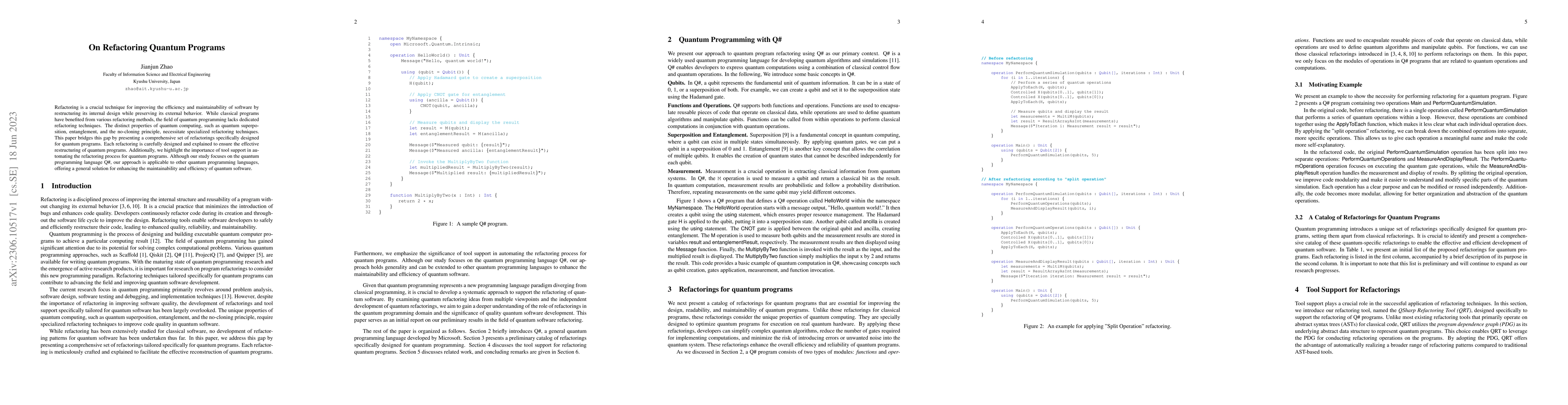 This paper introduces a set of specialized refactoring techniques for quantum programs, addressing the unique challenges of quantum computing. It aims to improve the maintainability and efficiency of quantum software, with a focus on the Q# language but applicable to others, and emphasizes the need for automated tool support.