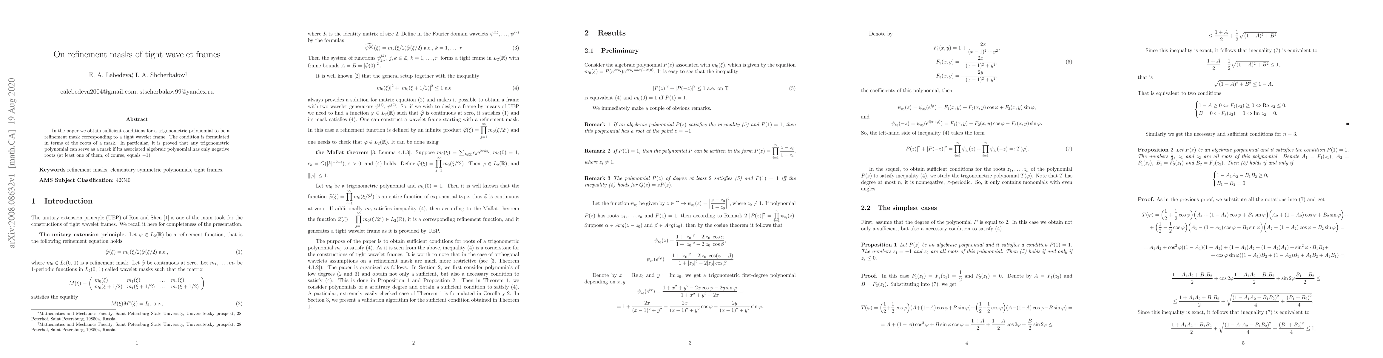 In the paper we obtain sufficient conditions for a trigonometric polynomial to be a refinement mask corresponding to a tight wavelet frame. The condition is formulated in terms of the roots of a mask. In particular, it is proved that any trigonometric polynomial can serve as a mask if its associated algebraic polynomial has only negative roots (at least one of them, of course, equals $-1$).