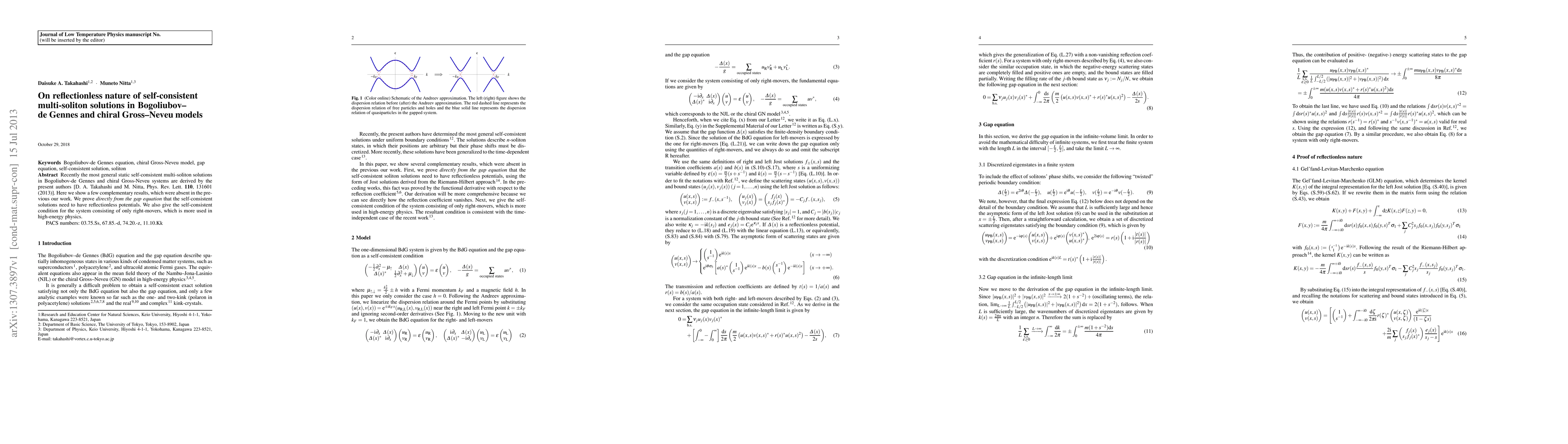 This paper proves that the self-consistent multi-soliton solutions in Bogoliubov-de Gennes and chiral Gross-Neveu models inherently possess reflectionless potentials, derived directly from the gap equation. It also provides a self-consistent condition for systems with only right-movers, commonly used in high-energy physics.