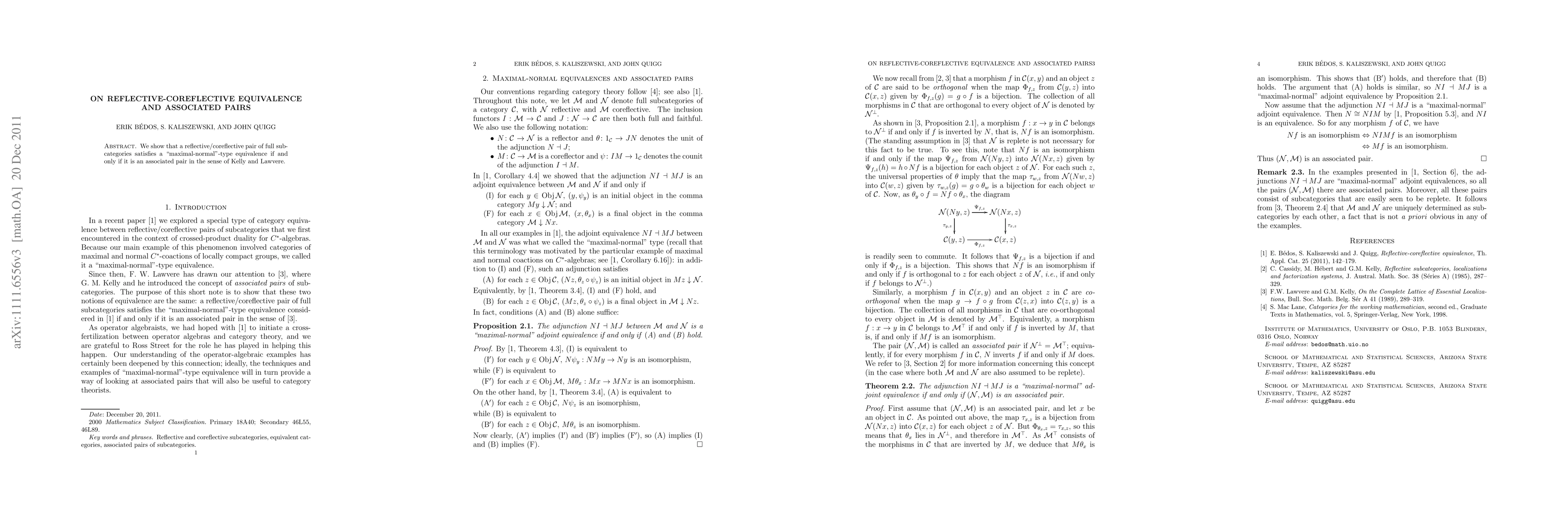 The paper demonstrates the equivalence between reflective/coreflective pairs of full subcategories satisfying a "maximal-normal" equivalence and being associated pairs as defined by Kelly and Lawvere. This establishes a fundamental connection between these two categorical concepts.