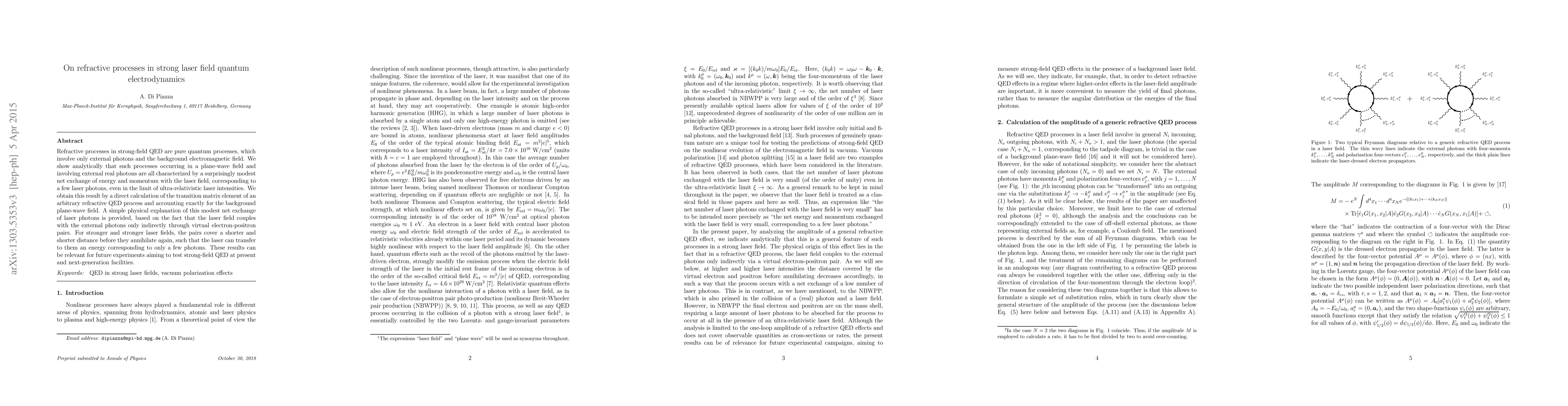 This paper demonstrates that refractive processes in strong-field quantum electrodynamics (QED) involve minimal energy and momentum exchange with the laser field, corresponding to a few laser photons, despite ultra-relativistic intensities. The modest net exchange is explained by the indirect coupling of the laser field through virtual electron-positron pairs, which annihilate shortly after formation.