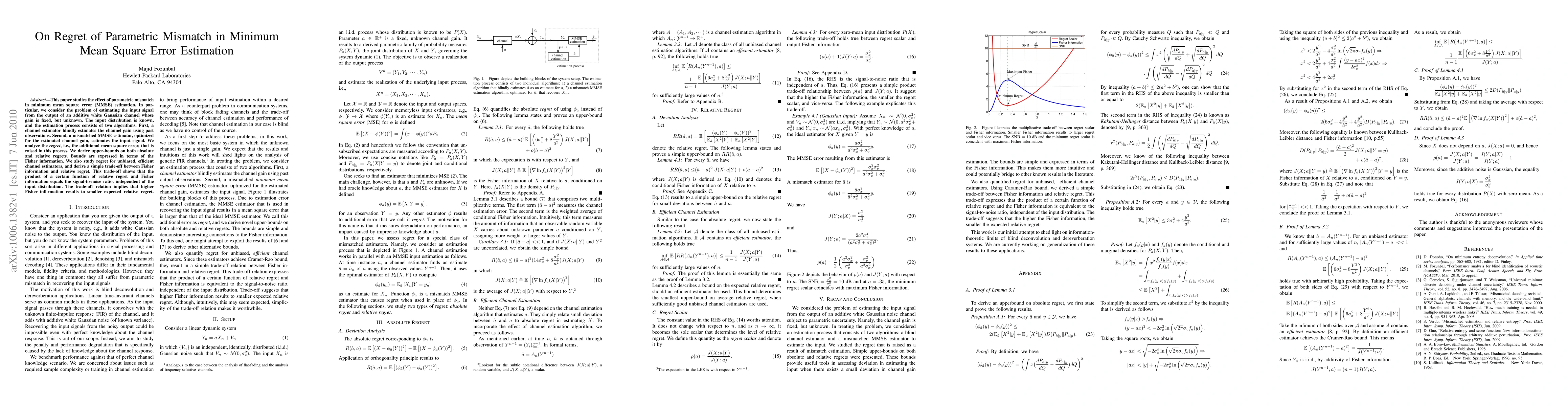 This paper studies the effect of parametric mismatch in minimum mean square error (MMSE) estimation. In particular, we consider the problem of estimating the input signal from the output of an additive white Gaussian channel whose gain is fixed, but unknown. The input distribution is known, and the estimation process consists of two algorithms. First, a channel estimator blindly estimates the channel gain using past observations. Second, a mismatched MMSE estimator, optimized for the estimated channel gain, estimates the input signal. We analyze the regret, i.e., the additional mean square error, that is raised in this process. We derive upper-bounds on both absolute and relative regrets. Bounds are expressed in terms of the Fisher information. We also study regret for unbiased, efficient channel estimators, and derive a simple trade-off between Fisher information and relative regret. This trade-off shows that the product of a certain function of relative regret and Fisher information equals the signal-to-noise ratio, independent of the input distribution. The trade-off relation implies that higher Fisher information results to smaller expected relative regret.