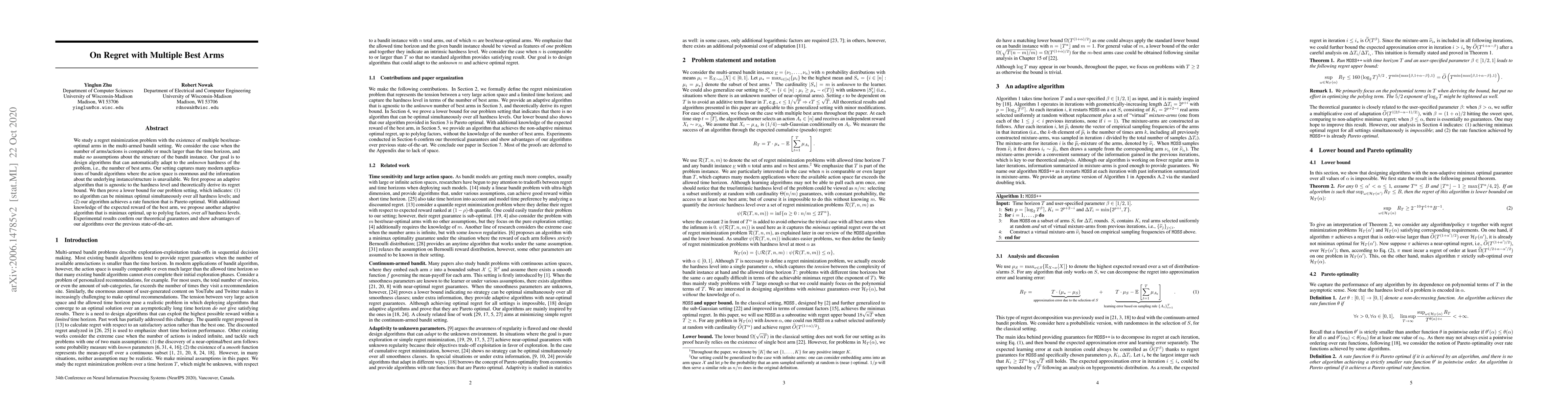 We study a regret minimization problem with the existence of multiple best/near-optimal arms in the multi-armed bandit setting. We consider the case when the number of arms/actions is comparable or much larger than the time horizon, and make no assumptions about the structure of the bandit instance. Our goal is to design algorithms that can automatically adapt to the unknown hardness of the problem, i.e., the number of best arms. Our setting captures many modern applications of bandit algorithms where the action space is enormous and the information about the underlying instance/structure is unavailable. We first propose an adaptive algorithm that is agnostic to the hardness level and theoretically derive its regret bound. We then prove a lower bound for our problem setting, which indicates: (1) no algorithm can be minimax optimal simultaneously over all hardness levels; and (2) our algorithm achieves a rate function that is Pareto optimal. With additional knowledge of the expected reward of the best arm, we propose another adaptive algorithm that is minimax optimal, up to polylog factors, over all hardness levels. Experimental results confirm our theoretical guarantees and show advantages of our algorithms over the previous state-of-the-art.