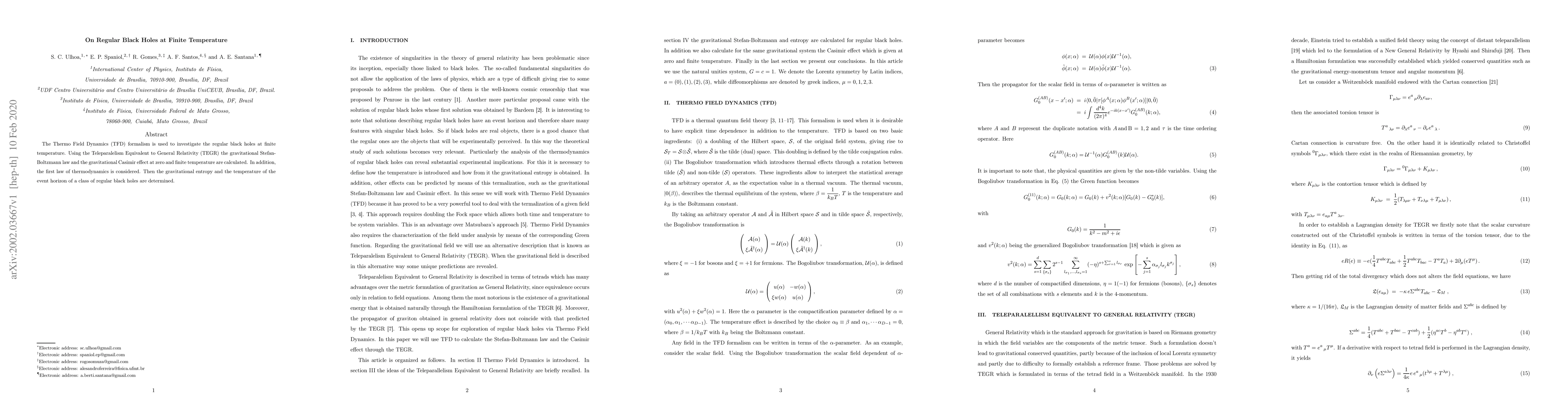 This paper explores regular black holes at finite temperature using the Thermo Field Dynamics (TFD) formalism and Teleparalelism Equivalent to General Relativity (TEGR), calculating the gravitational Stefan-Boltzmann law, Casimir effect, and entropy, and determining the temperature of the event horizon.