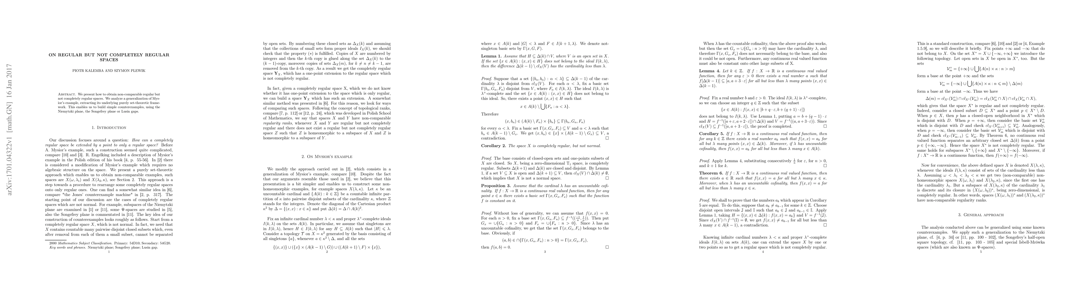 This paper explores the construction of non-comparable regular but not completely regular spaces, generalizing Mysior's example through a set-theoretic framework, and utilizes the Niemytzki plane, the Songefrey plane, and Lusin gaps to create these counterexamples.