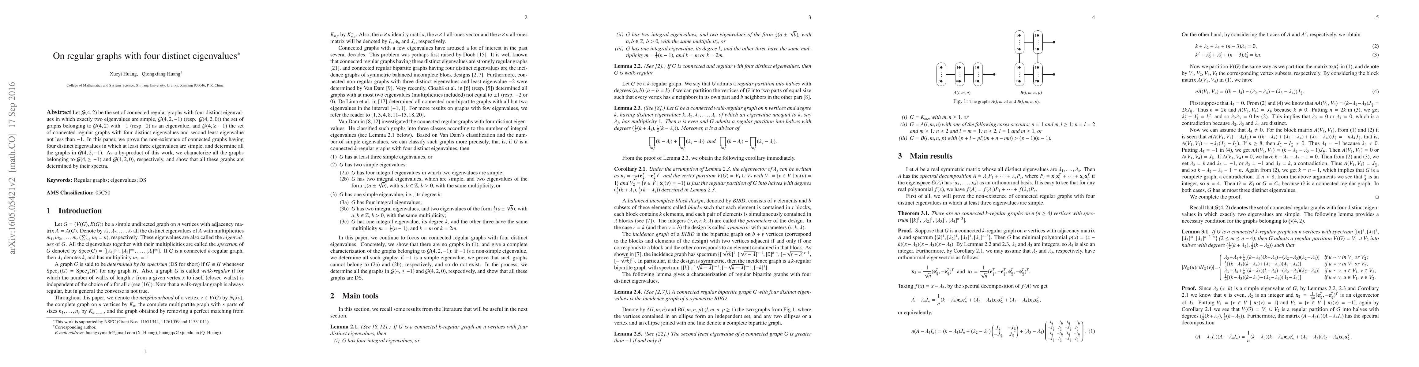 Let $\mathcal{G}(4,2)$ be the set of connected regular graphs with four distinct eigenvalues in which exactly two eigenvalues are simple, $\mathcal{G}(4,2,-1)$ (resp. $\mathcal{G}(4,2,0)$) the set of graphs belonging to $\mathcal{G}(4,2)$ with $-1$ (resp. $0$) as an eigenvalue, and $\mathcal{G}(4,\geq -1)$ the set of connected regular graphs with four distinct eigenvalues and second least eigenvalue not less than $-1$. In this paper, we prove the non-existence of connected graphs having four distinct eigenvalues in which at least three eigenvalues are simple, and determine all the graphs in $\mathcal{G}(4,2,-1)$. As a by-product of this work, we characterize all the graphs belonging to $\mathcal{G}(4,\geq-1)$ and $\mathcal{G}(4,2,0)$, respectively, and show that all these graphs are determined by their spectra.