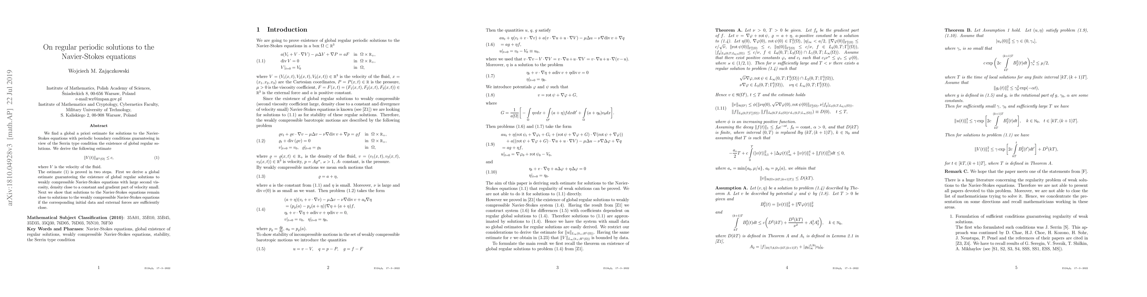 This paper establishes a global a priori estimate for solutions to the Navier-Stokes equations under periodic boundary conditions, ensuring the existence of global regular solutions via a Serrin-type condition. The key estimate, $$\lVert V(t) \rVert_{H^1(\Omega)}\leq c,$$ is derived in two steps: first for weakly compressible Navier-Stokes equations, and then showing that solutions remain close if initial data and external forces are sufficiently close.