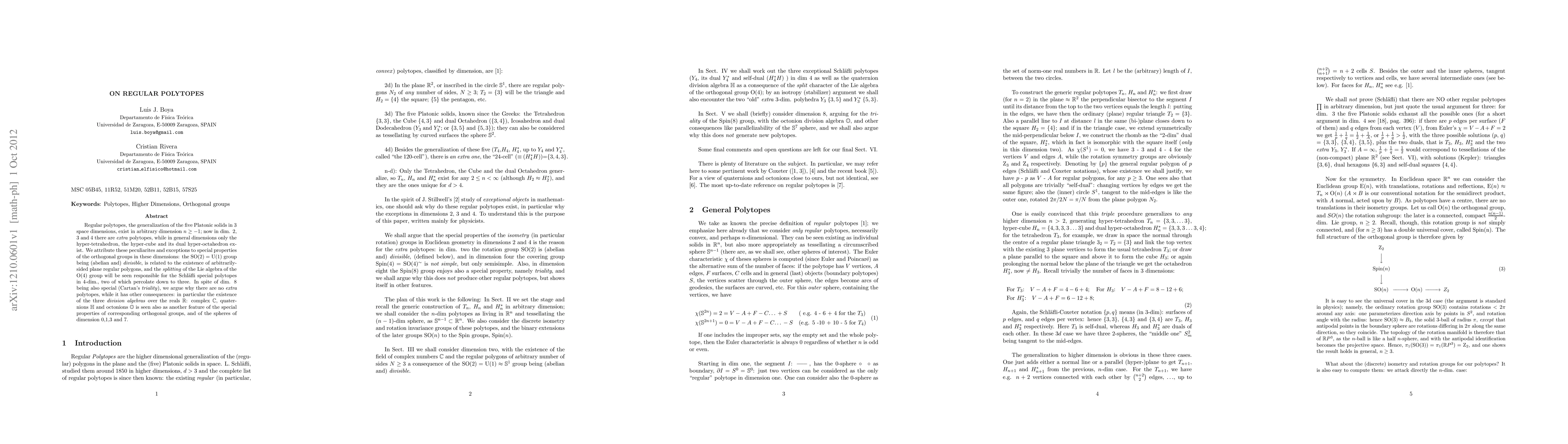 This paper explores the existence and properties of regular polytopes in various dimensions, noting that while extra polytopes exist in dimensions 2, 3, and 4, only the hyper-tetrahedron, hyper-cube, and hyper-octahedron exist in general dimensions. It attributes these peculiarities to special properties of orthogonal groups, particularly the abelian and divisible nature of $\mathrm{SO}(2)$ and the splitting of the $\mathrm{O}(4)$ group's Lie algebra.