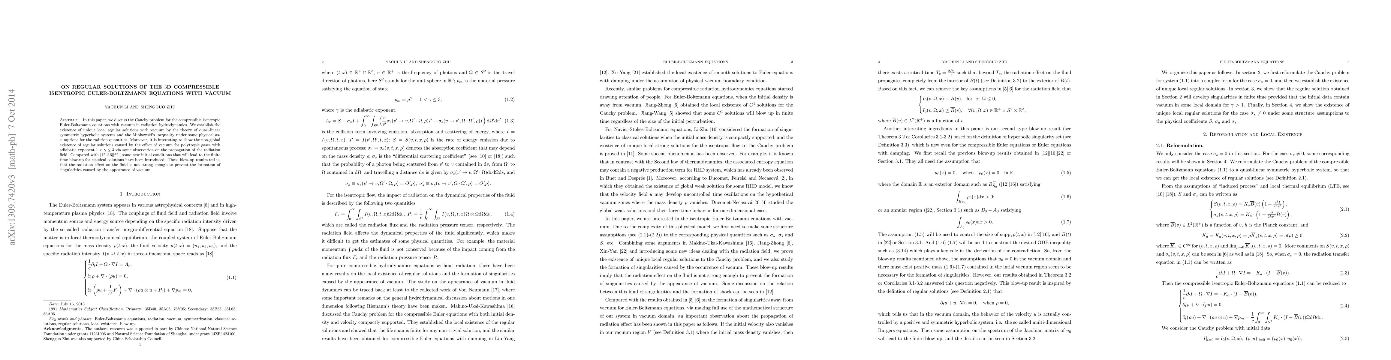 In this paper, we discuss the Cauchy Problem for the compressible isentropic Euler-Boltzmann equations with vacuum in radiation hydrodynamics. Firstly, we establish the local existence of regular solutions by the fundamental methods in the theory of quasi-linear symmetric hyperbolic systems under some physical assumptions. Then we give the non-global existence of regular solutions caused by the effect of vacuum for $1<\gamma\leq 3$. Finally, we extend our result to the initial-boundary value problem under some suitable boundary conditions. These blow-up results tell us that the radiation cannot prevent the formation of singularities caused by the appearance of vacuum.