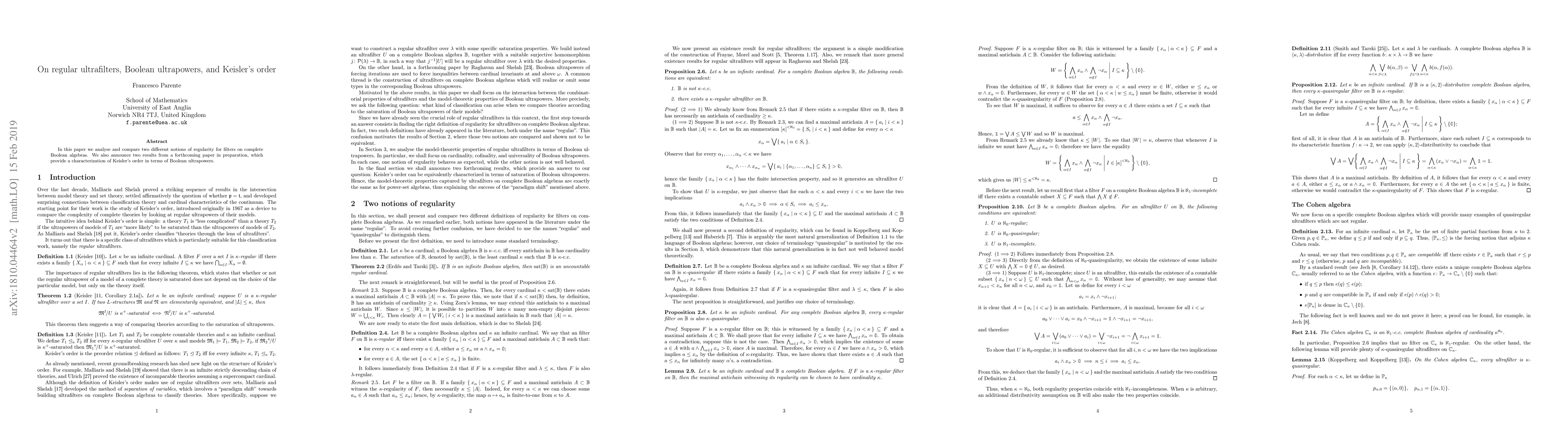This paper examines the regularity of filters on complete Boolean algebras and compares two notions of regularity. It also previews forthcoming results characterizing Keisler's order in relation to Boolean ultrapowers.