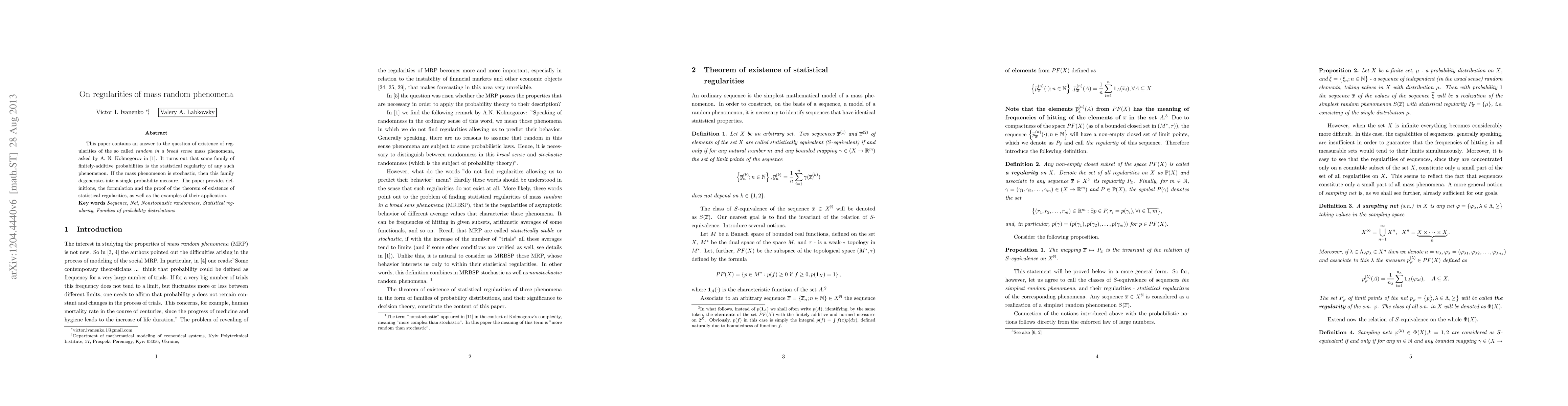 This paper investigates the existence of statistical regularities in mass phenomena deemed random in a broad sense, confirming Kolmogorov's query. It demonstrates that a family of finitely-additive probabilities represents these regularities, which simplifies to a single measure in stochastic cases.