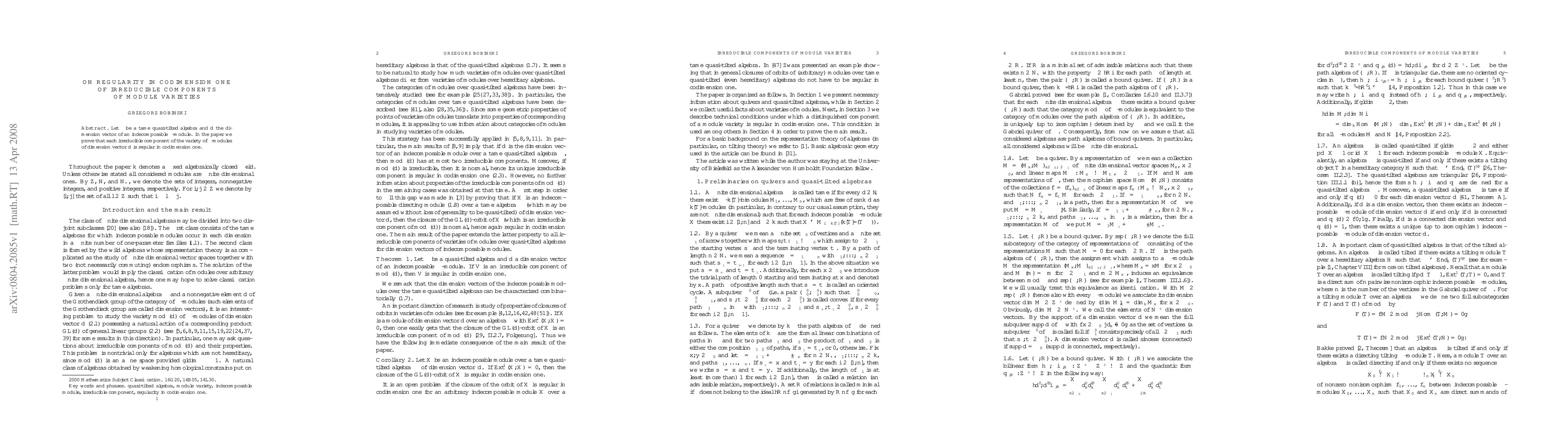 This paper proves that for a specific type of algebra A, known as tame quasi-tilted algebras, the irreducible components of the variety of A-modules with a given dimension vector d are regular in codimension one.