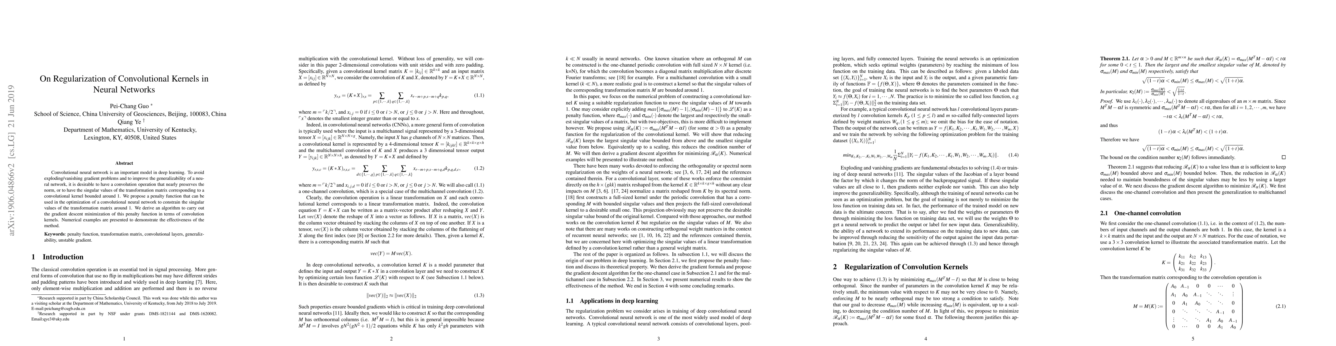 This paper proposes a regularization method to constrain the singular values of convolutional kernel matrices in neural networks around $1$, aiming to mitigate gradient issues and improve generalizability. An algorithm is developed for gradient descent optimization of this penalty function, and numerical examples validate its effectiveness.