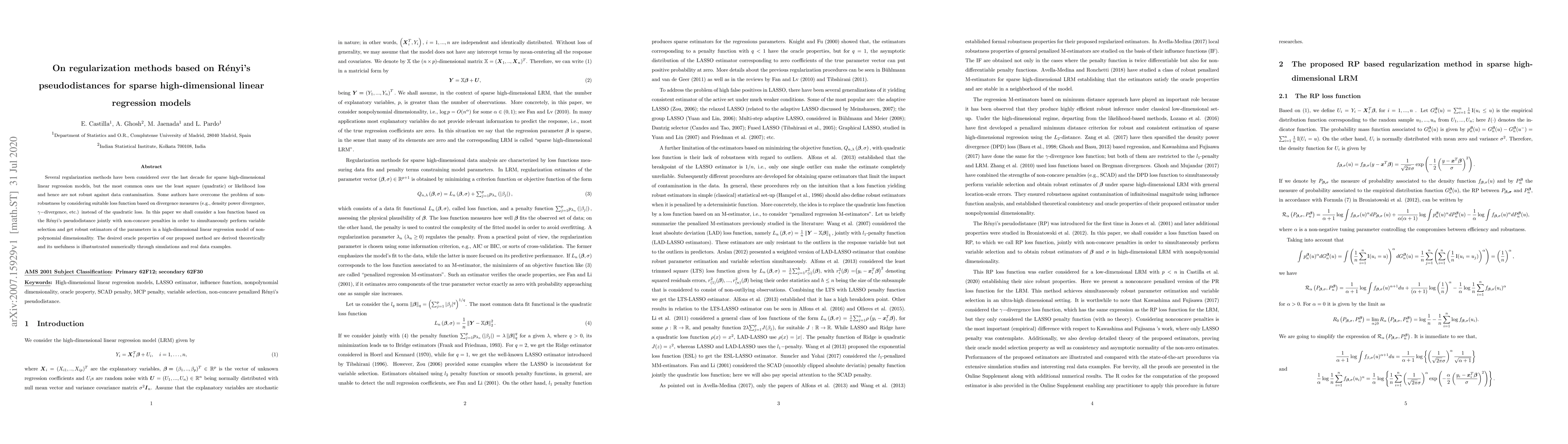 This paper proposes regularization methods using R\'enyi's pseudodistances for sparse high-dimensional linear regression, aiming for robust parameter estimation against data contamination. Theoretical oracle properties and numerical simulations demonstrate the effectiveness of the method.