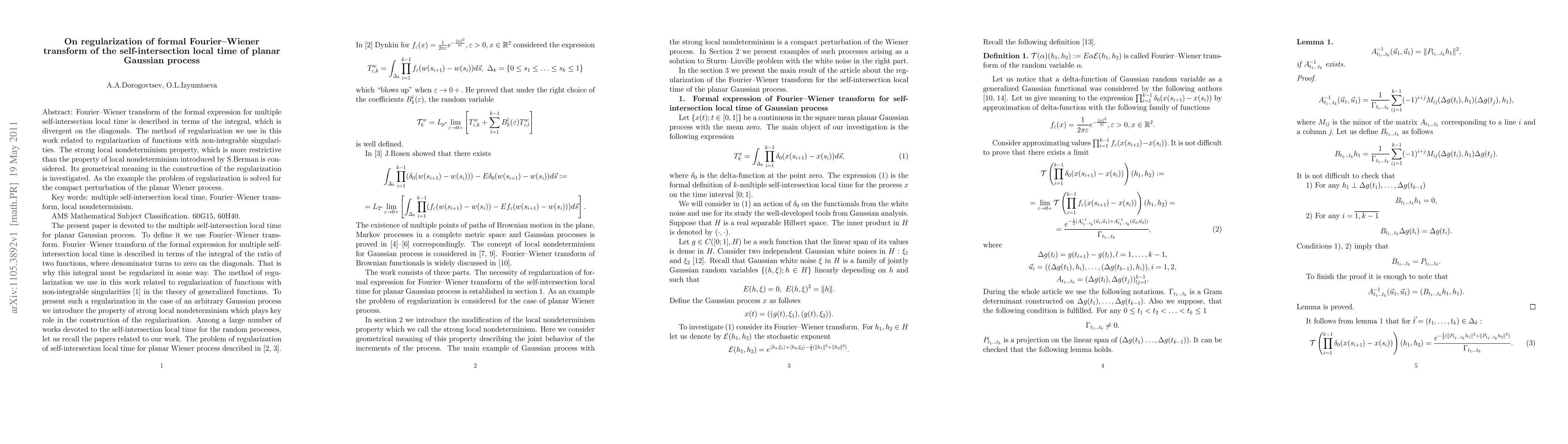 Fourier-Wiener transform of the formal expression for multiple self-intersection local time is described in terms of the integral, which is divergent on the diagonals. The method of regularization we use in this work related to regularization of functions with non-integrable singularities. The strong local nondeterminism property, which is more restrictive than the property of local nondeterminism introduced by S.Berman is considered. Its geometrical meaning in the construction of the regularization is investigated. As the example the problem of regularization is solved for the compact perturbation of the planar Wiener process.