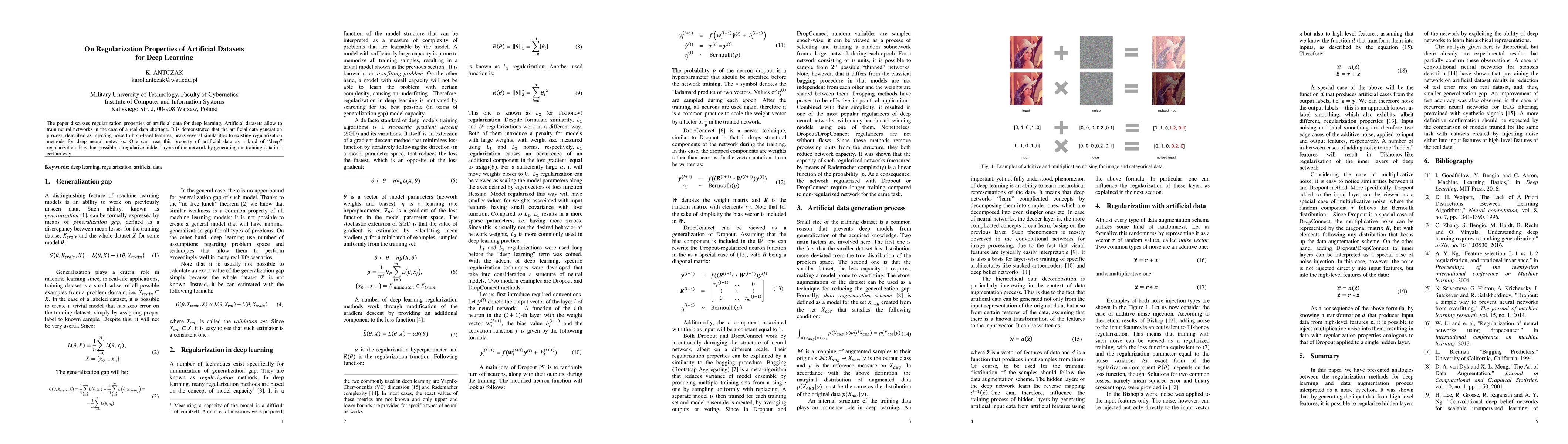 Artificial datasets for deep learning can act as a form of regularization, generating training data with noise that helps to prevent overfitting in hidden layers. This approach enables the use of artificial data when real data is scarce.