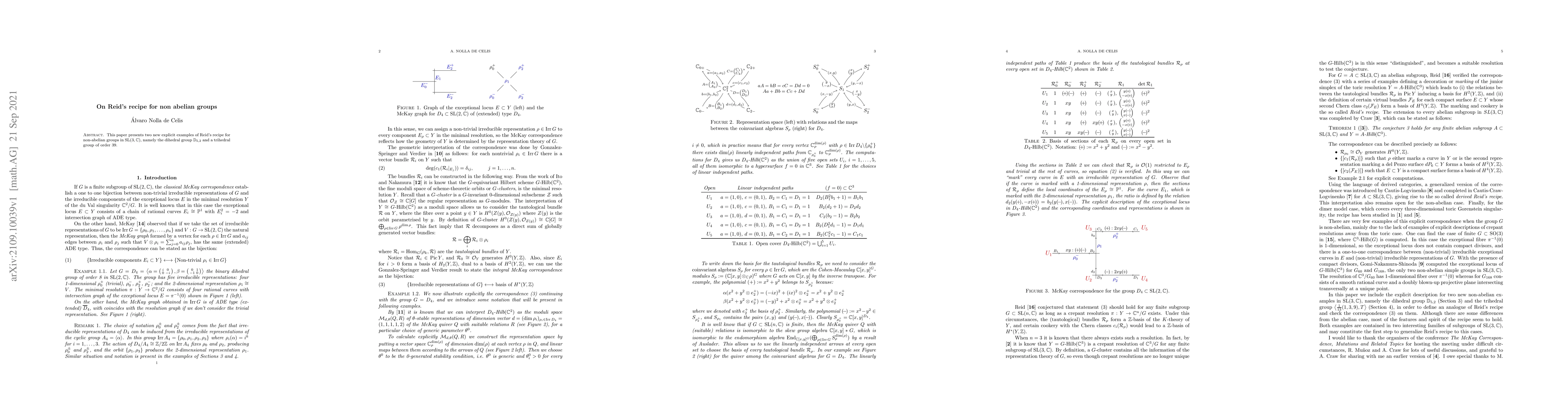 This paper presents two new explicit examples of Reid's recipe for non-abelian groups in $SL(3,\mathbb{C})$, namely the dihedral group $\mathbb{D}_{5,2}$ and a trihedral group of order 39.