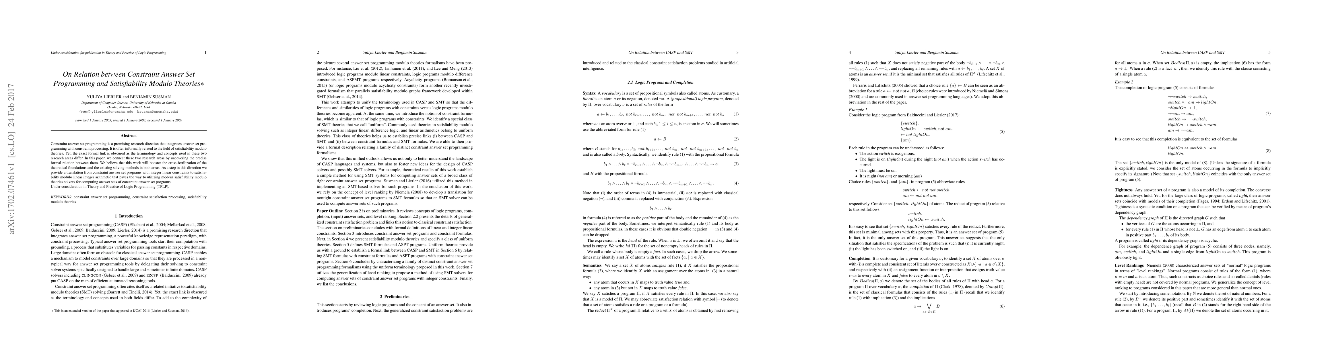 This paper establishes a formal connection between constraint answer set programming and satisfiability modulo theories, providing a translation method to leverage modern SMT solvers for computing answer sets. The work aims to enhance cross-fertilization between the theoretical foundations and solving methods of both fields.